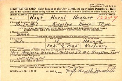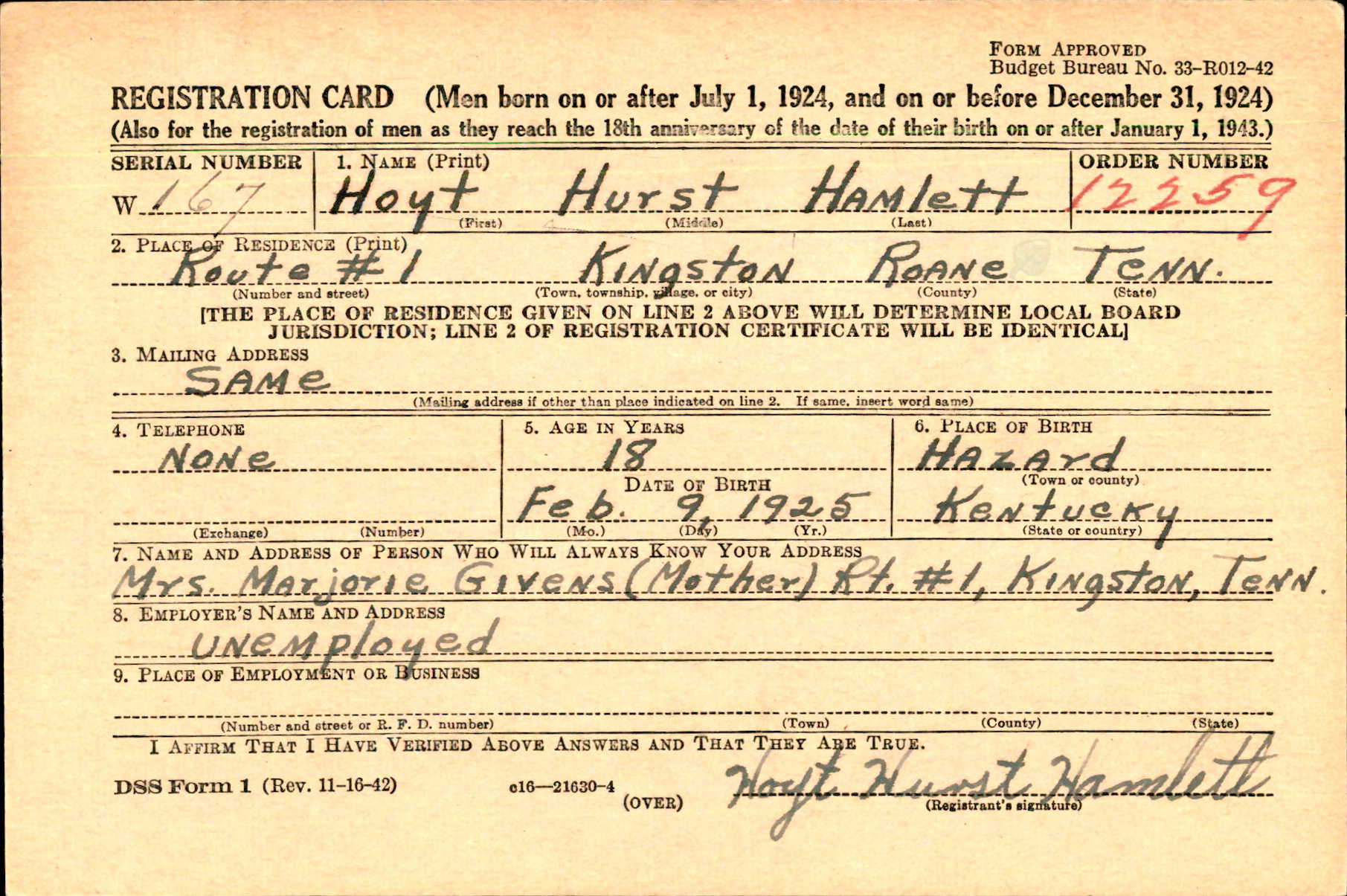 Hoyt Hurst Hamlett was born in Hazard, Kentucky, the son of Harry Edward Hamlett and Marjorie Mae Williams.