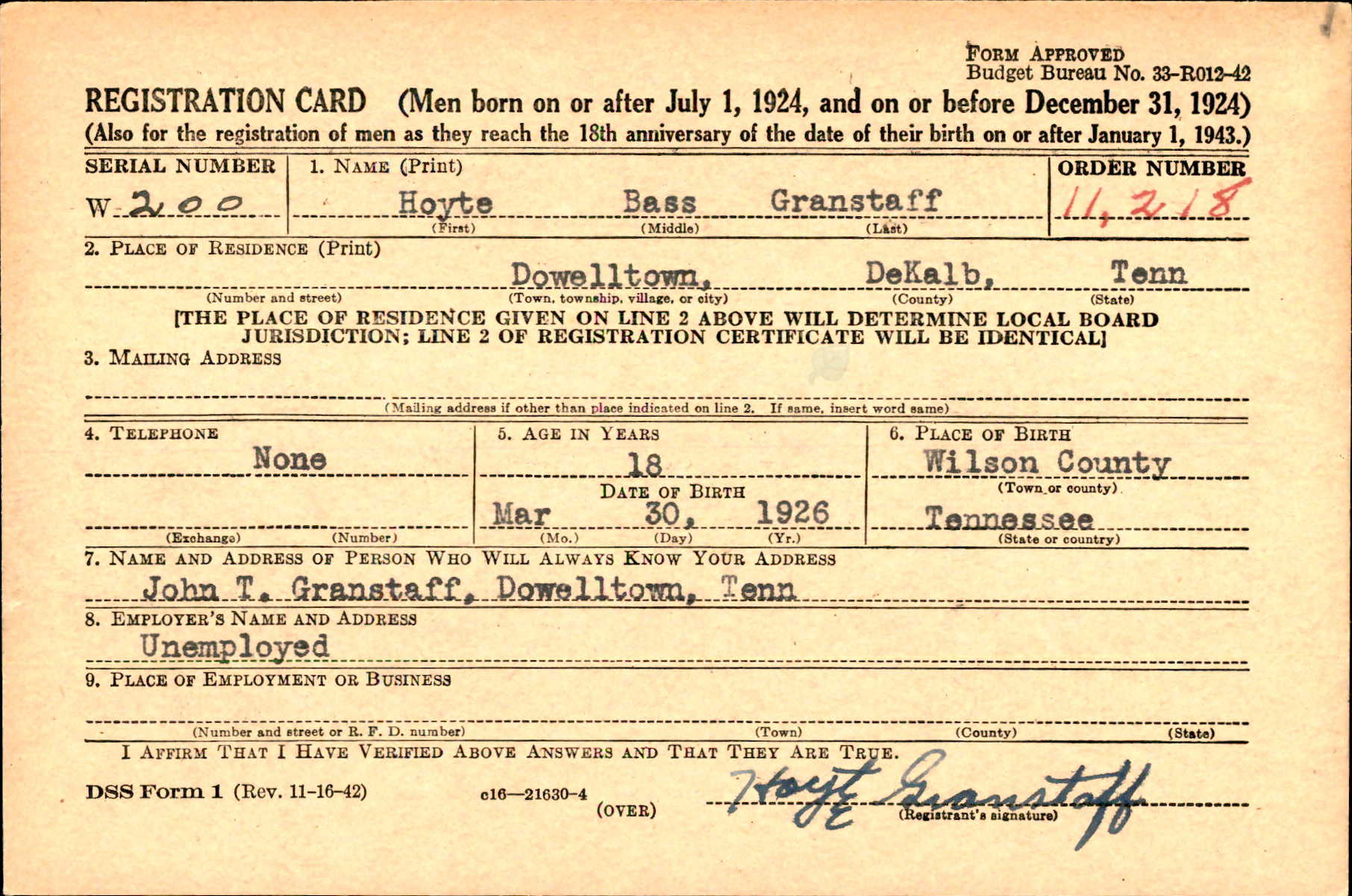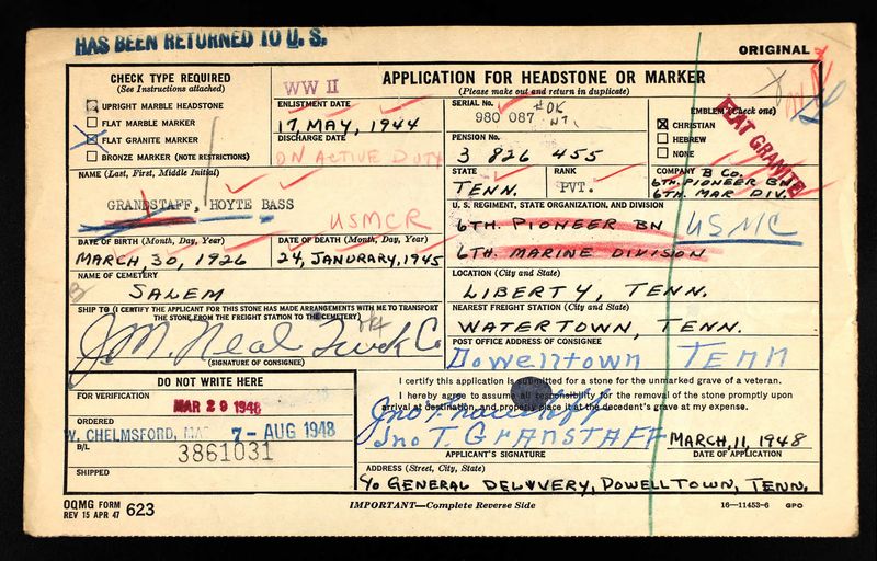 Hoyte Bass Granstaff was born on 30 March 1926, the son of John Tecumseh Grindstaff and Hazel Beatrice Bass.