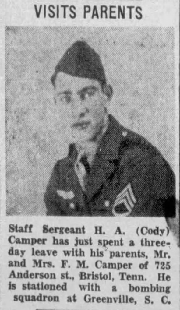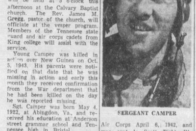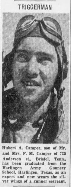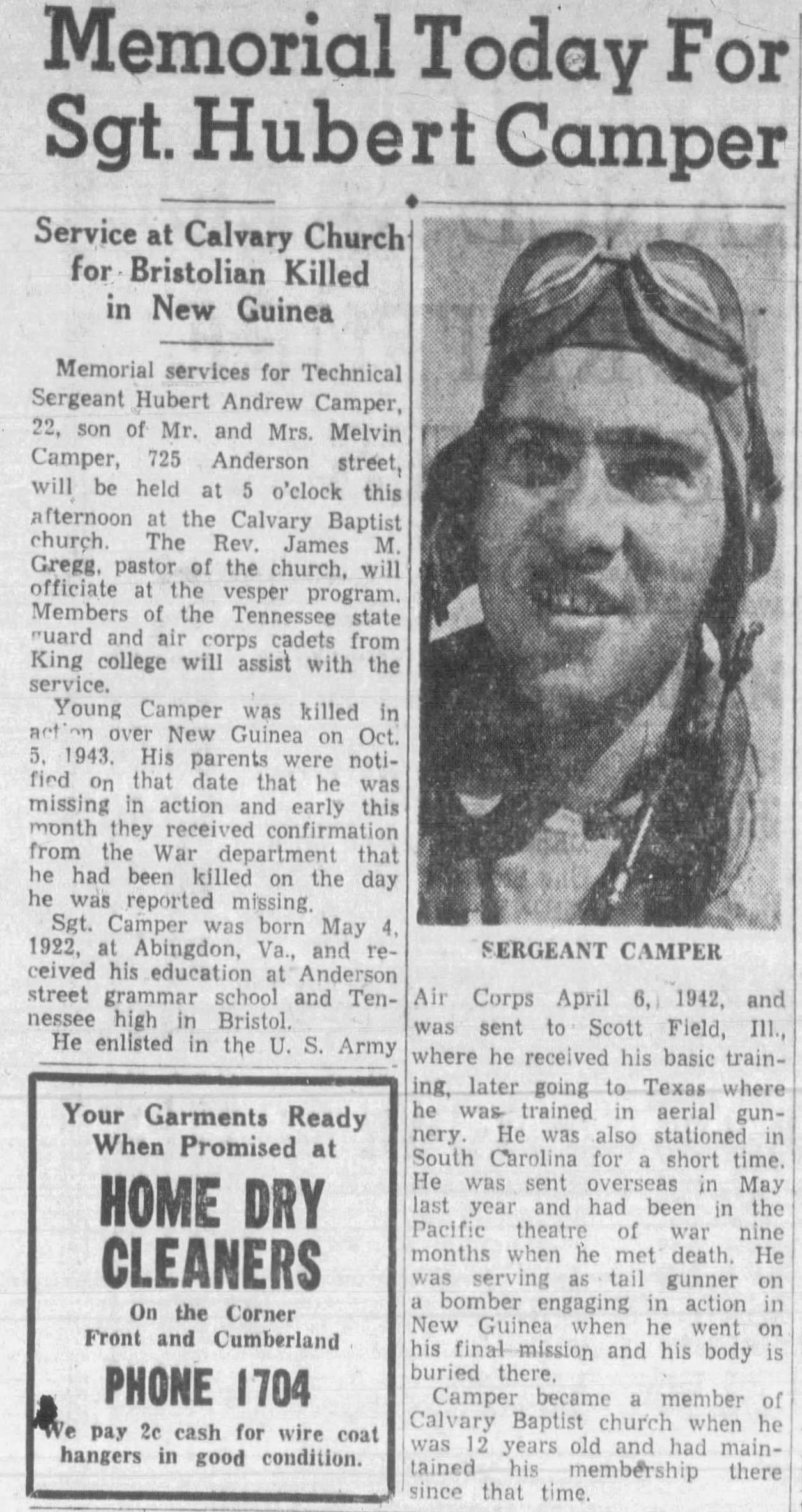Memorial services for Technical Sergeant Hubert Andrew Camper, 22, son of Mr. and Mrs. Melvin Camper, 725 Anderson street, will be held at 5 o’clock this afternoon at the Calvary Baptist Church. Young Camper was killed in action over New Guinea on Oct. 5, 1943. His parents were notified on that date that he was missing in action and early this month they received confirmation from the War department that he had been killed on that day he was reported missing. Sgt. Camper was born May 4, 1922 at Abingdon, Va., and received his education at Anderson street grammar school and Tennessee high in Bristol. He enlisted in the U.S. Army Air Corps April 6, 1942, and was sent to Scott Field, Ill., where he received his basic training, later going to Texas where he was trained in aerial gunnery. He was also stationed in South Carolina for a short time. He was sent overseas in May last year and had been in the Pacific theatre of war nine months when he met death. He was serving as tail gunner on a bomber engaging in action in New Guinea when he went on his final mission and his body is buried there. Camper became a member of Calvary Baptist church when he was 12 years old and had maintained his membership there since that time.