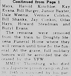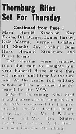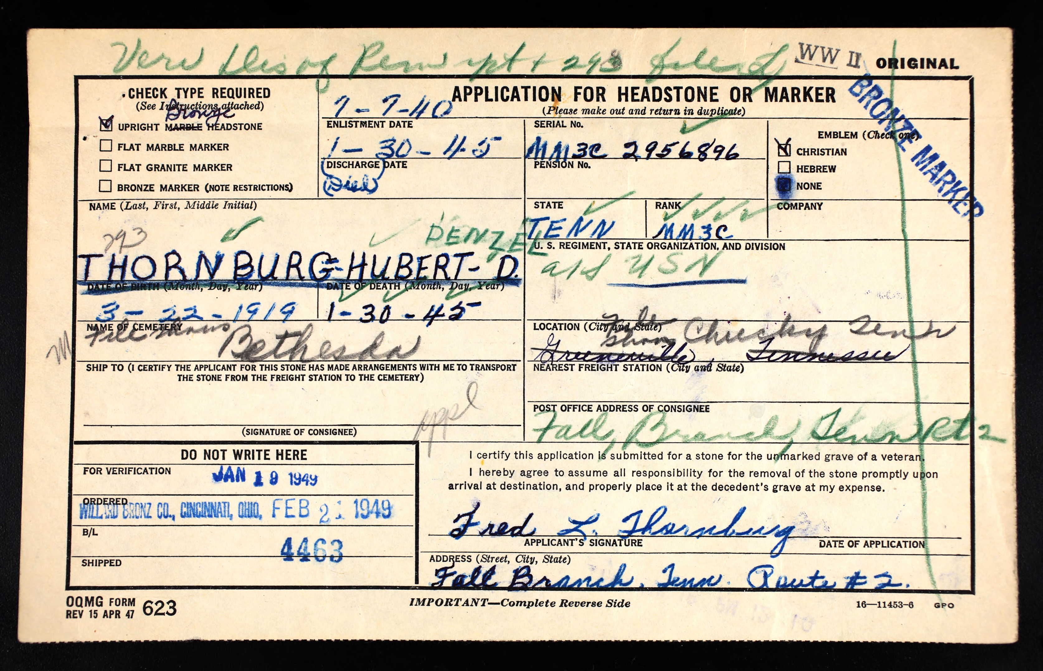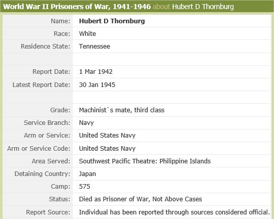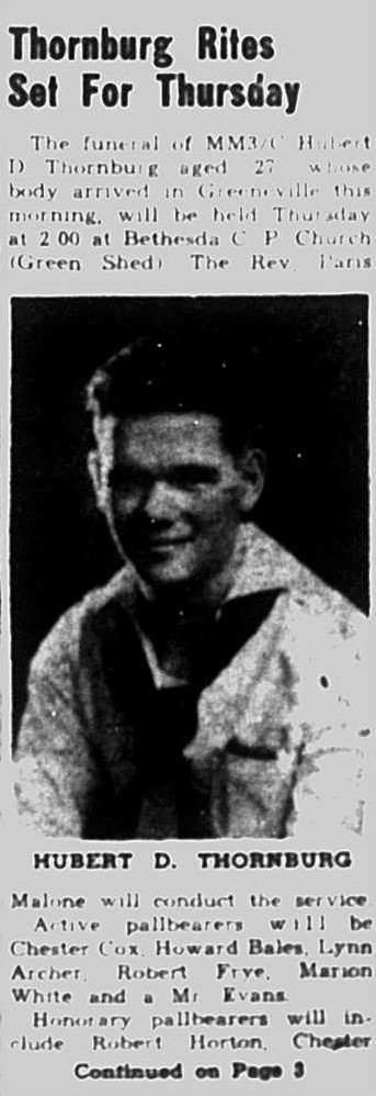 Hubert Denzil Thornburg was born March 22, 1919, in Greene County to Mary Kate Carico Thornburg and Fred Luther Thornburg. He entered the service when he was 17 years of age. While he was serving on the USS “Pope” (see information below), the Japanese bombed Pearl Harbor. The Japanese picked him up at sea, and he was put in prison camp (Java POW Camps D.X.Y. (Batavia) Java 6-107 ). In prison camp for three years and three months, he died there from starvation and dysentery January 30, 1945. His body was returned to Greeneville, TN, in 1949 and buried at Bethesda C.P. Church Cemetery in northern Greene County. He was never married.