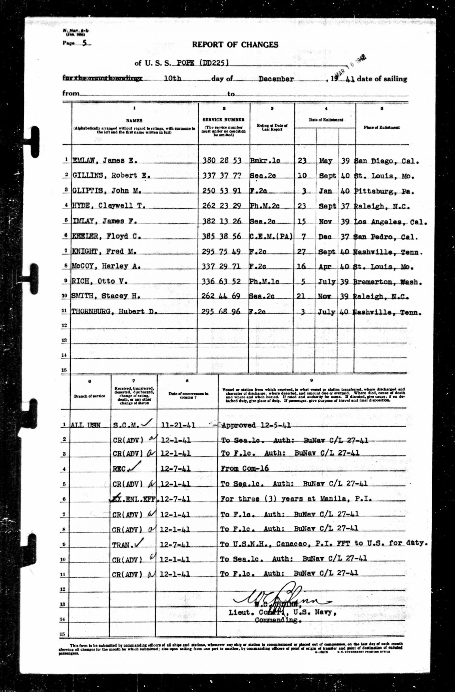The USS Pope DD-225 was based at Manila Bay, Philippines, on 7 December 1941. She left the Philippines for the East Indies and joined the American, British, Dutch, and Australian Fleet ABDA. Following the Battle of Java Sea against a superior force, the Pope was assigned to escort, along with HMS Encounter DD, the damaged heavy cruiser HMS Exeter to safety. At 07h30 1 March 1942 they encountered a Japanese force of two heavy cruisers and a three destroyers The Allied force began a running battle to safety. It is believed the Pope sank the Japanese heavy cruiser Ashigara with torpedoes during this action. Exter and Encounter were sunk shortly after 11h40. The Pope continued to fight on. At 12h30 the Pope came under attack by 12 aircraft and was severely damaged. The ship was scuttled and as she was sinking, was hit by cruiser gunfire which expedited the sinking. The crew abandoned ship and was taken into captivity the next day.