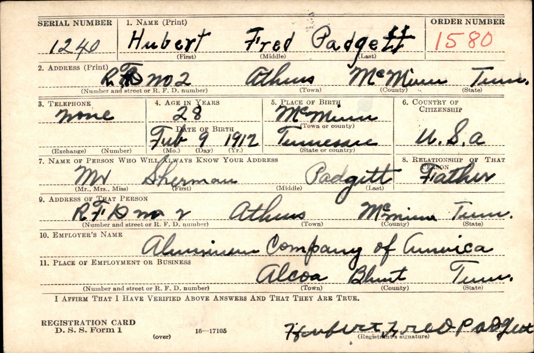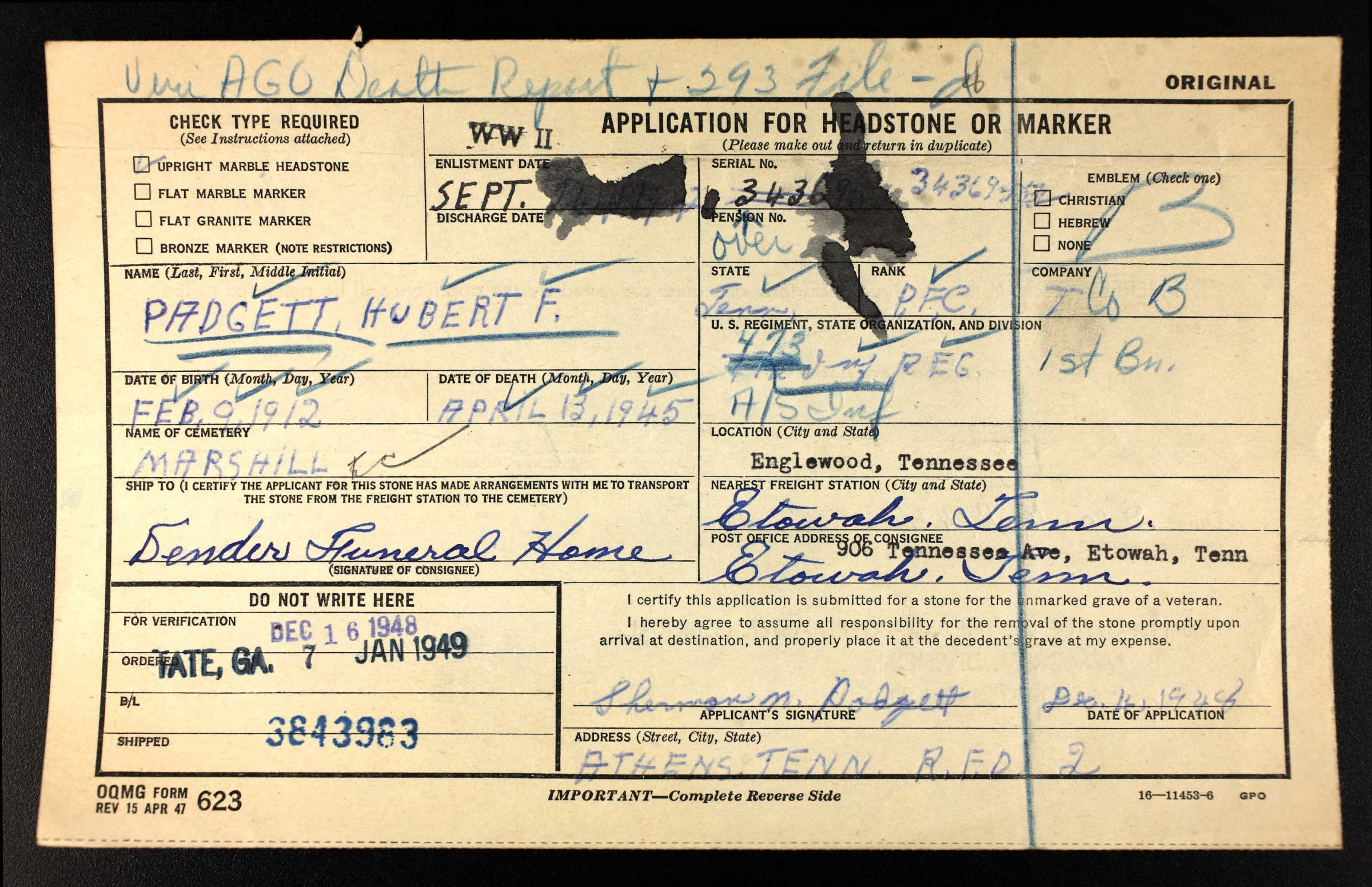 Private First Class Hubert F. Padgett was born on 9 February 1912. He was the son of Sherman Nathaniel Padgett and Mary Myrtle Shadden.