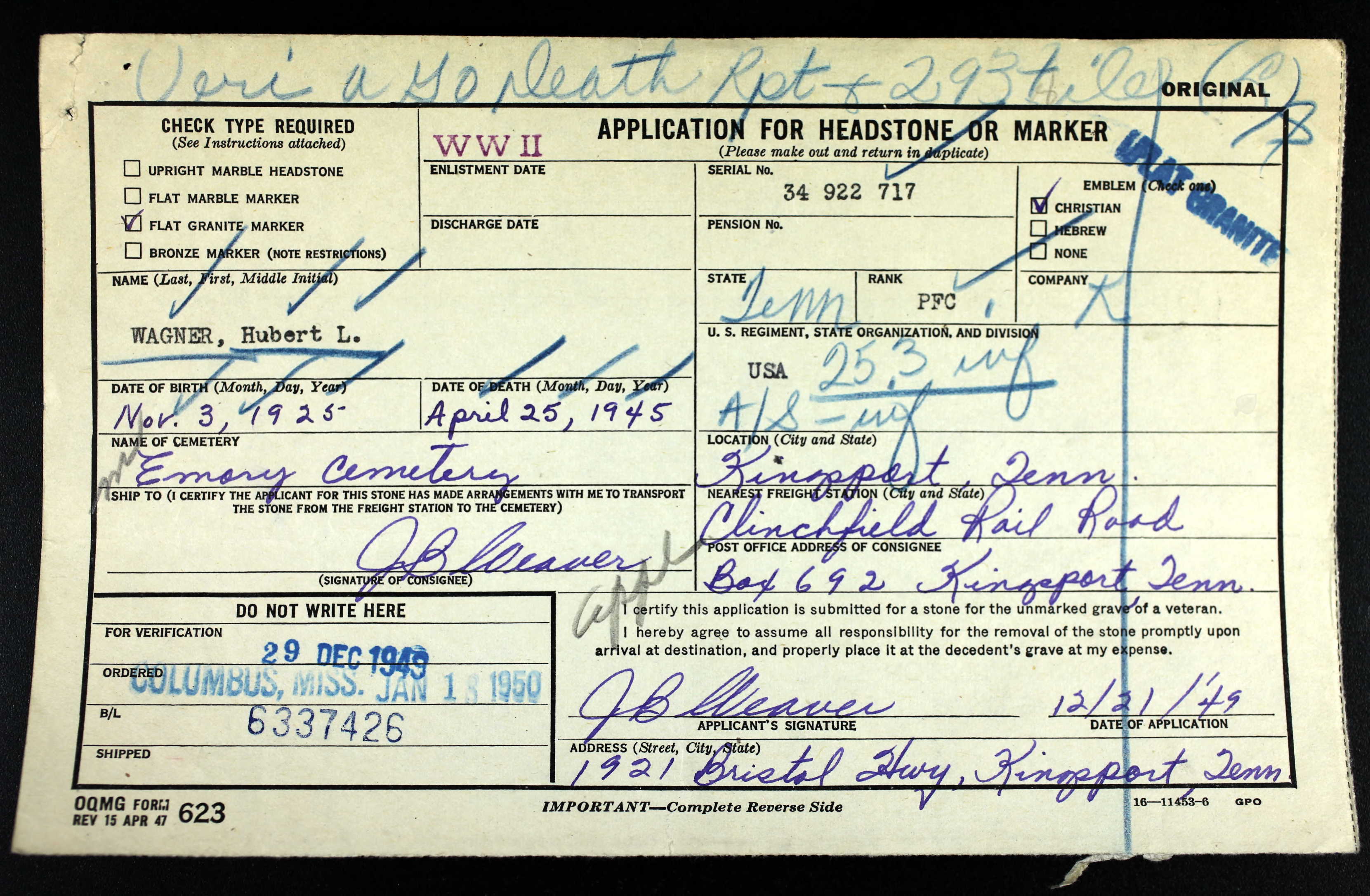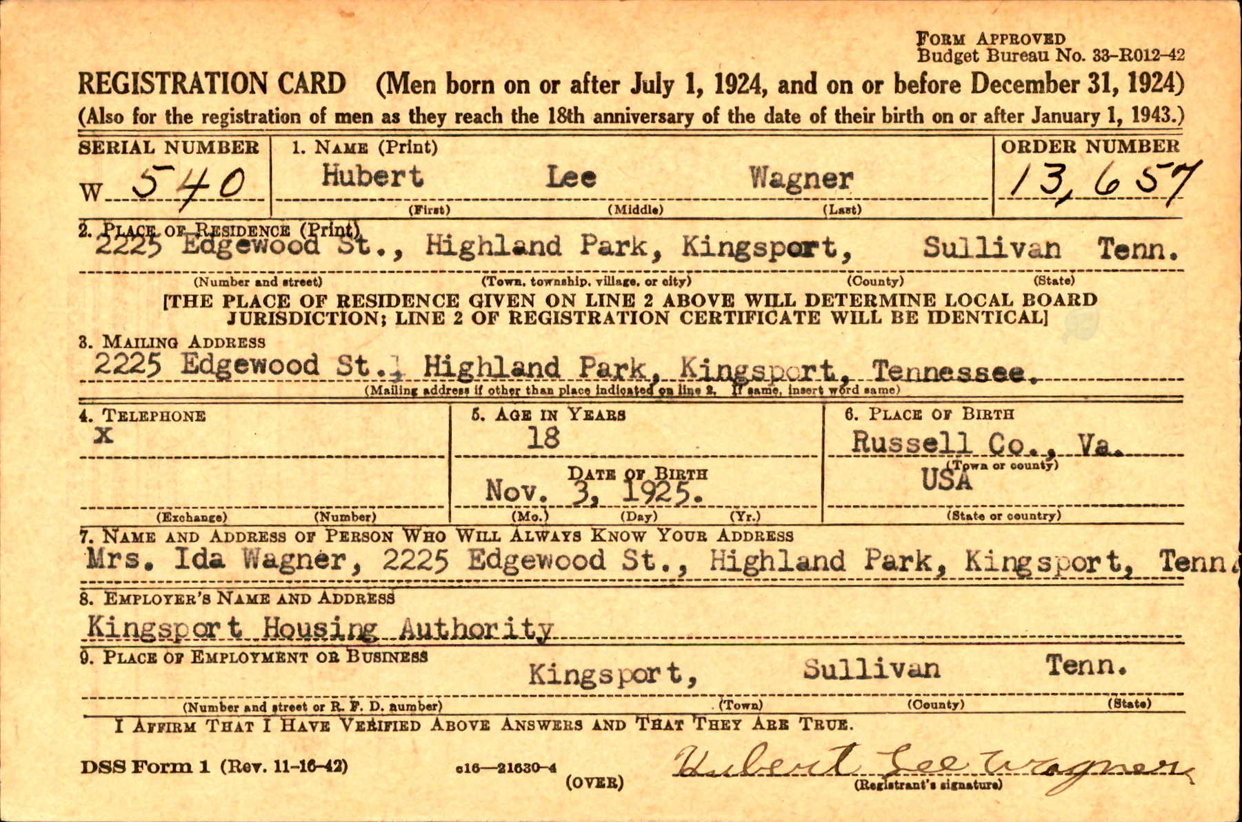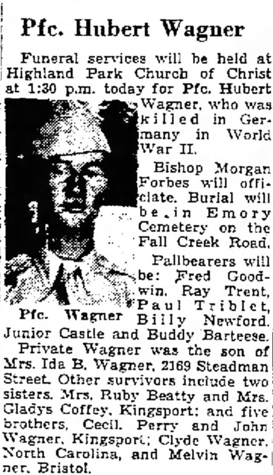 Besides his mother, Private Wagner is survived by two sisters, Miss Gladys Wagner and Miss Ruby Wagner, both of Kingsport and five brothers, Perry and Cecil Wagner of Kingsport, Melvin Wagner of Bristol, Clyde Wagner of Spindale N.C., and John Wagner of Virginia.