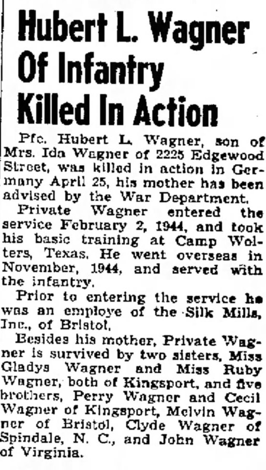 PFC Hubert L. Wagner, son of Mrs Ida Wagner of 2225 Edgewood Street, was killed in action in Germany April 25, his mother has been advised by the War Department. Private Wagner entered the service February 2, 1944 and took his basic training at Camp Wolters, Texas. He went overseas in November 1944 and served with the infantry. Prior to entering the service he was an employe of the Silk Mills Inc. of Bristol.
