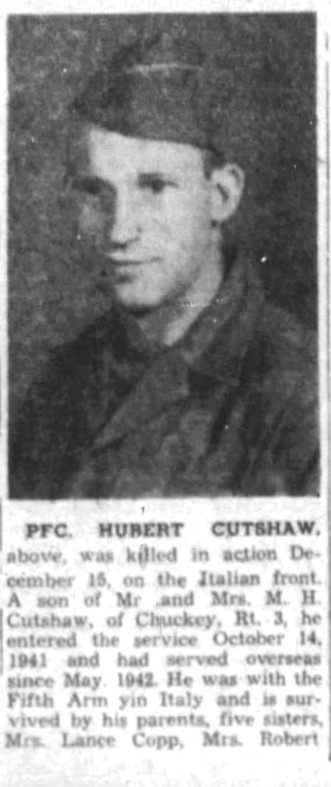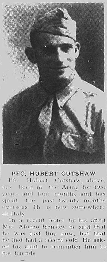 Pfc. Hubert Cutshaw, above, has been in the Army for two years and four months and has spent the past twenty months overseas. He is now somewhere in Italy. In a recent letter to his aunt, Mrs. Alonzo Hensley he said that he was just fine now, but that he had been a recent cold. He asked his aunt to remember him to his friends.
