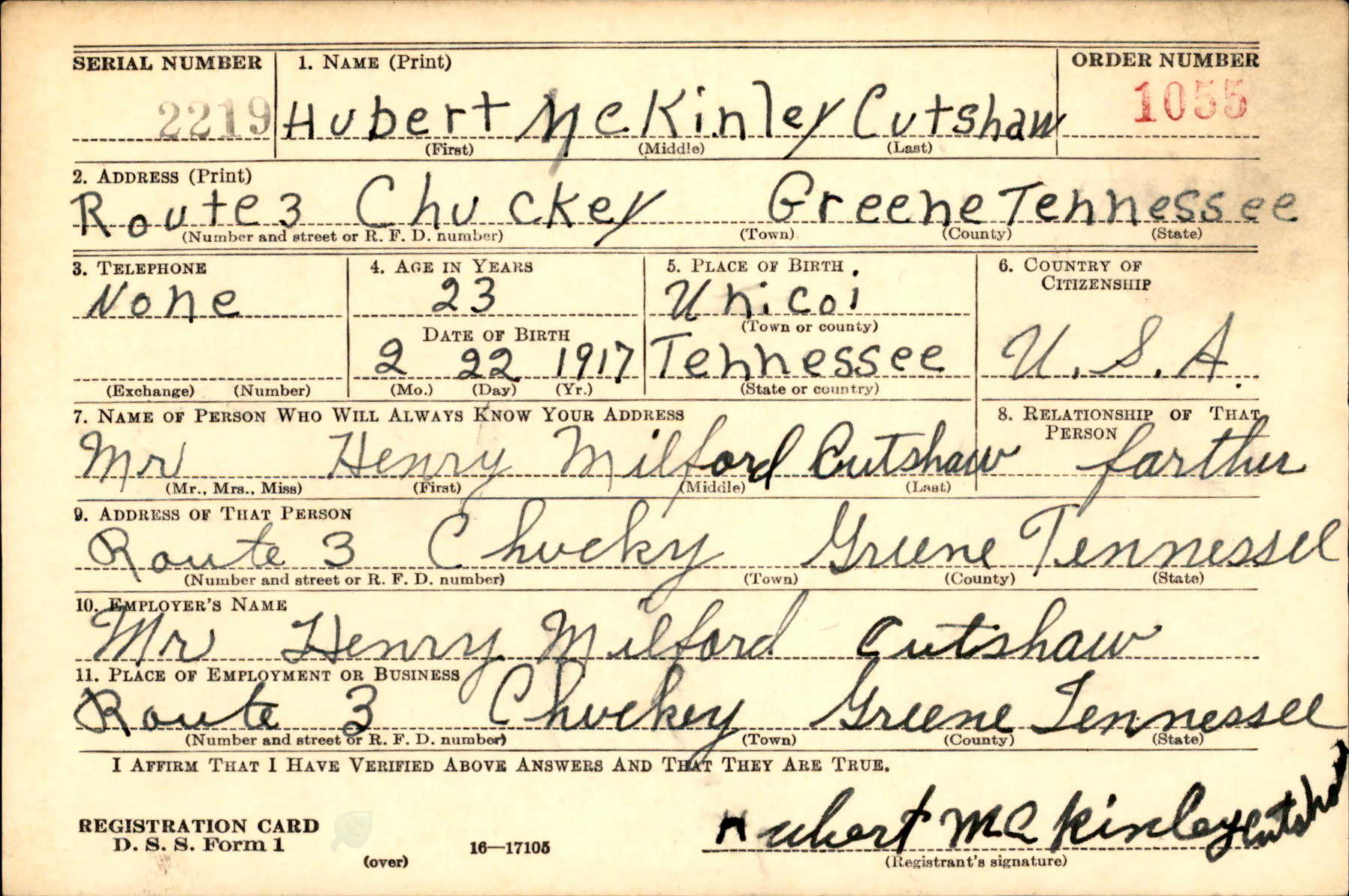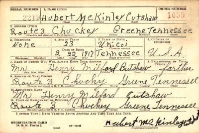 Hubert Mckinley Cutshaw was born 22 February 1917, Tennessee, son of Henry Milford Cutshaw and Dora Damsel Shelton. Husband of Alma Jewel Householder.
