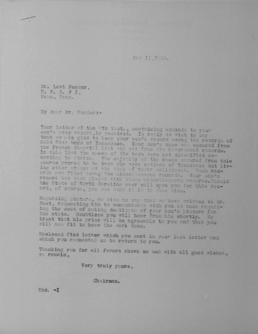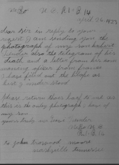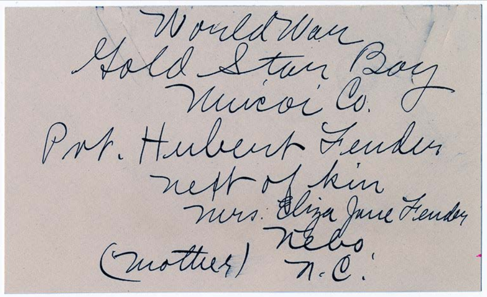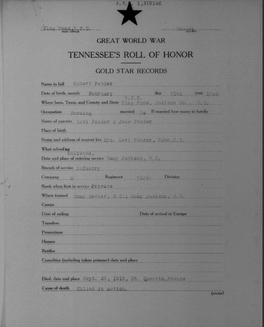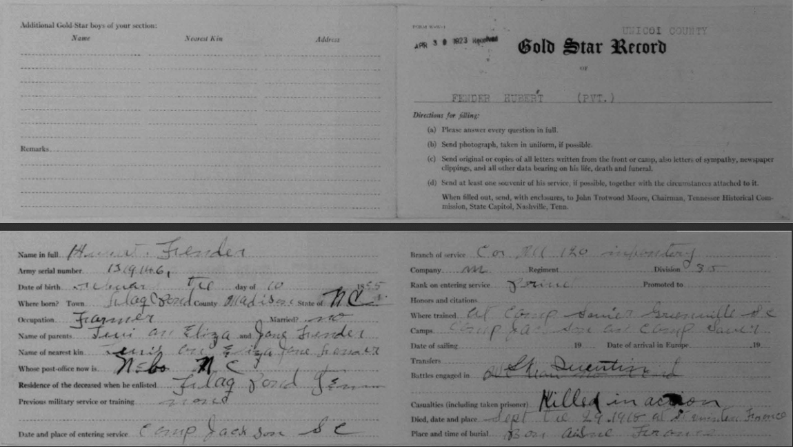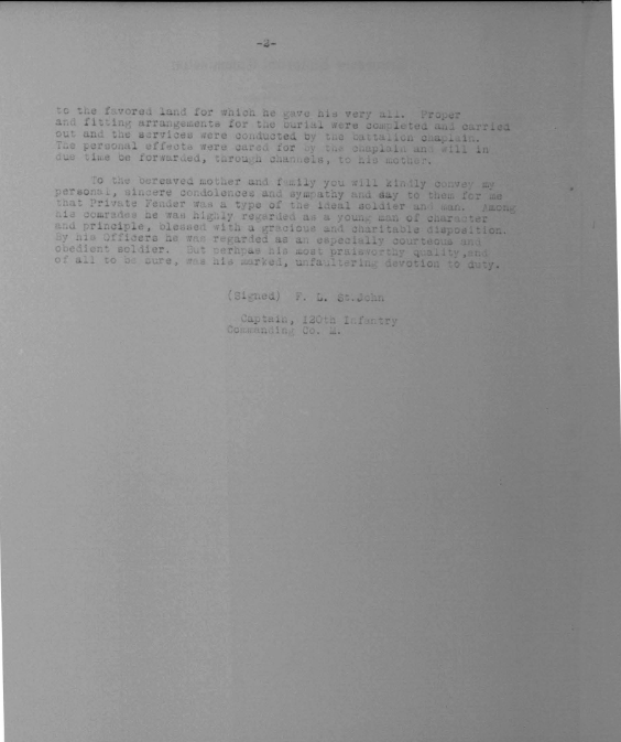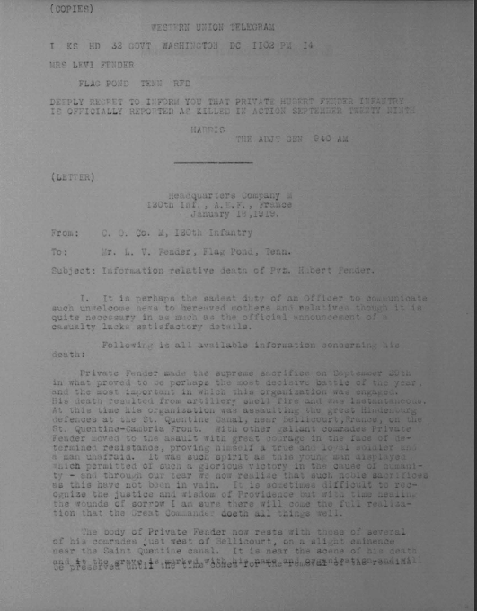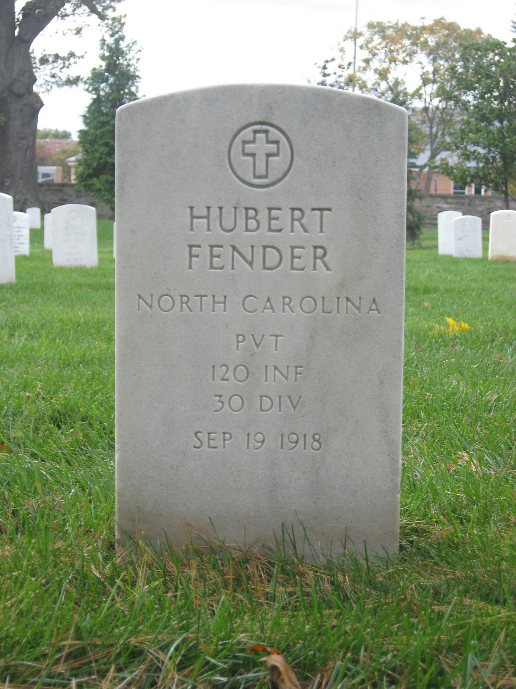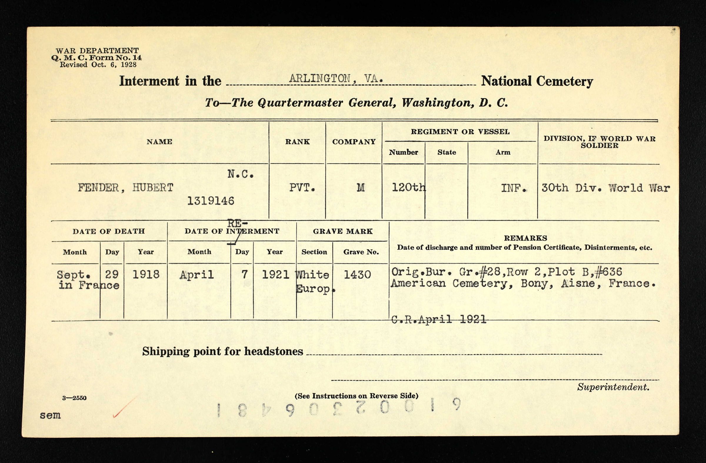 Pvt Fender was killed in action at St. Quintin and was initially buried at the Somme American Cemetery, Bony, Aisne, France. He is buried at Arlington National Cemetery, Arlington, VA, Euro, 1430.