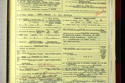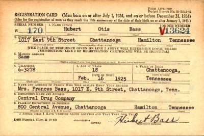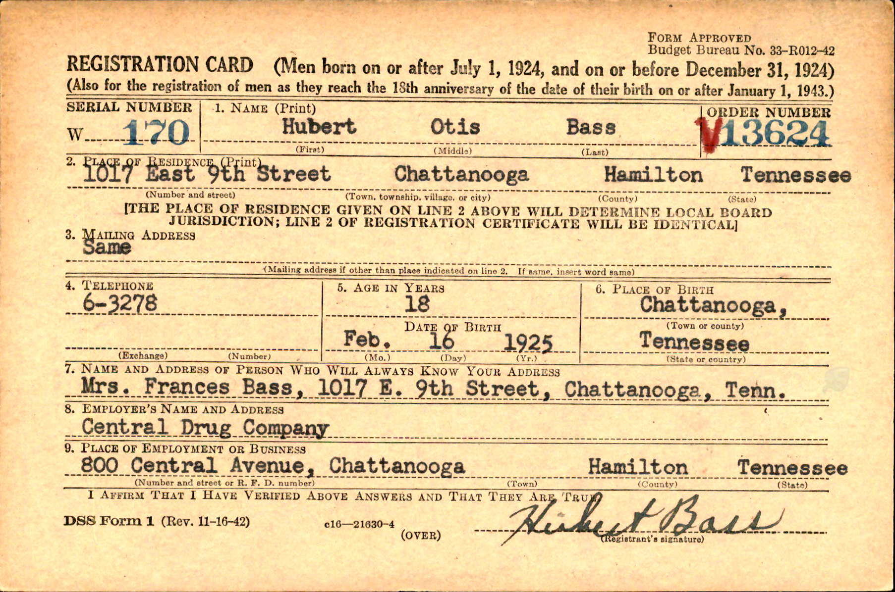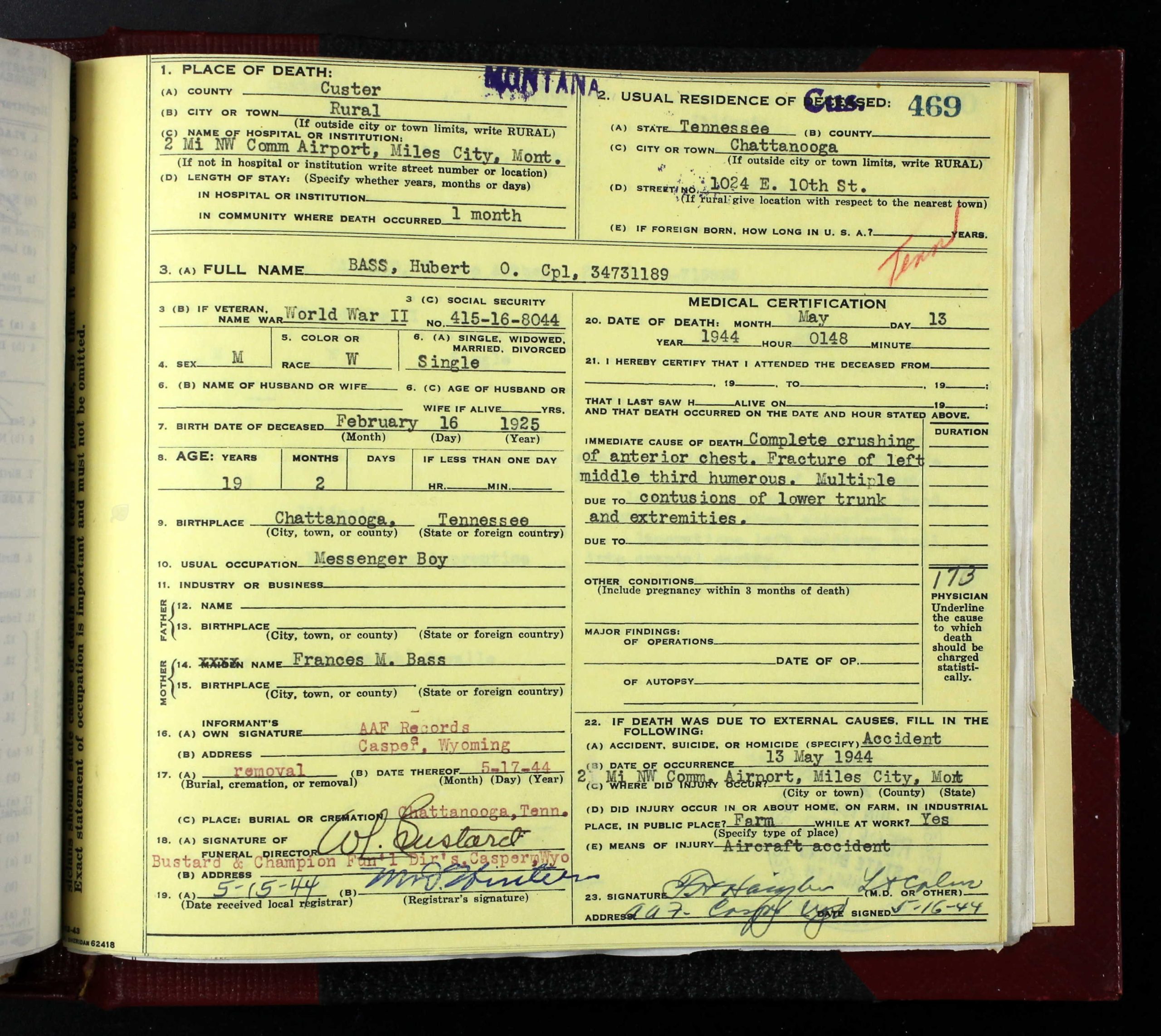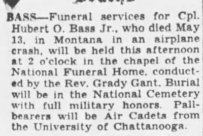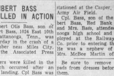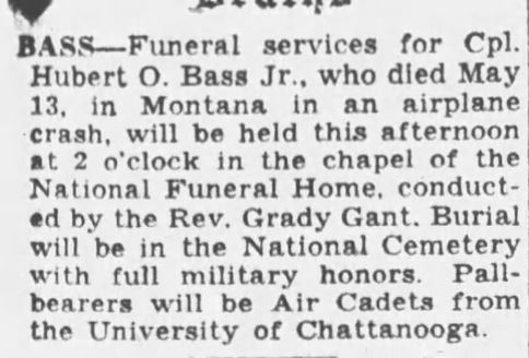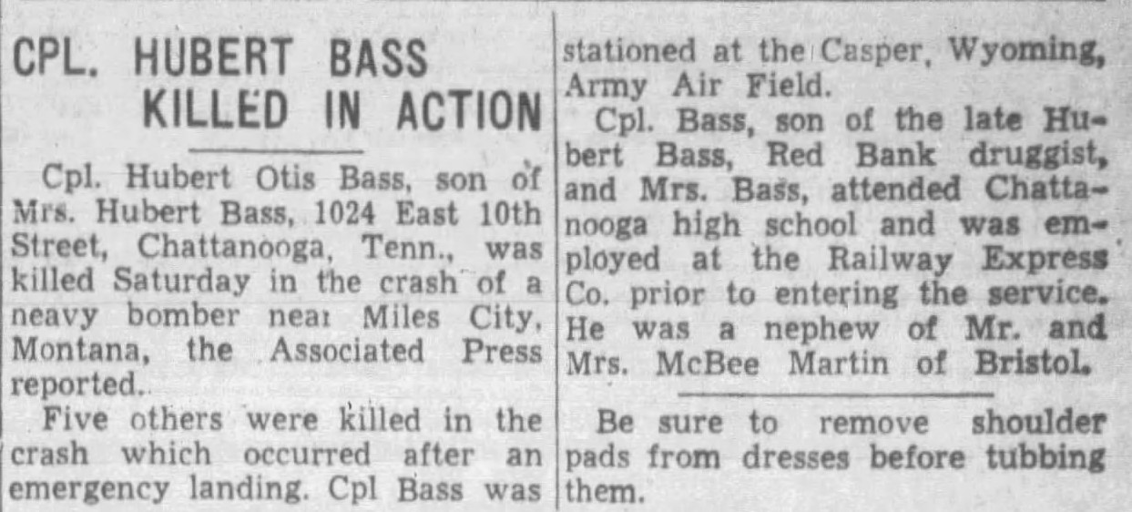 Cpl. Hubert Otis Bass, son of Mrs. Hubert Bass, 1024 East 10th Street, Chattanooga, Tenn., was killed Saturday in the crash of a heavy bomber near Miles City, Montana, the Associated Press reported. Five others were killed in the crash which occurred aftera n emergency landing. Cpl. Bass was stationed at the Casper, Wyoming Army Air Field. Cpl. Bass, son of the late Hubert Bass, Red Bank druggist, and Mrs. Bass, attended Chattanooga High School and was employed at the Railwy Express Co. prior to entering the service. He was a nephew of Mr. and Mrs. McBee Martin of Bristol.