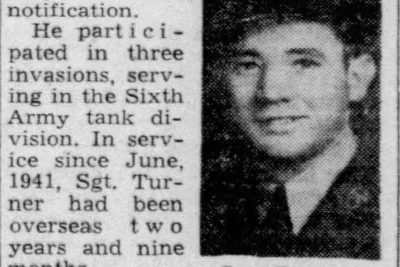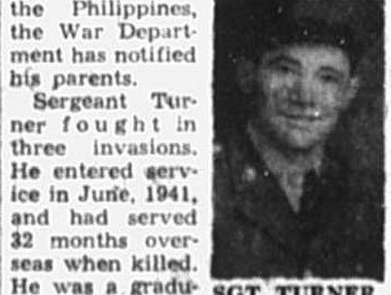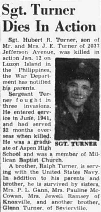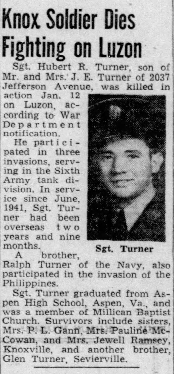 Sgt. Hubert R. Turner, son of Mr. and Mrs. J.E. Turner of 2037 Jefferson Avenue, was killed in action Jan. 12 on Luzon, according to War Department notification. He participated in three invasions, serving in the Sixth Army tank division. In service since June, 1941, Sgt. Turner had been overseas two years and nine months. A brother, Ralph Turner of the Navy, also participated in the invasion of the Philippines. Sgt Turner graduated from Aspen High School, Aspen, Va., and was a member of Millican Baptist Church. Survivors include sisters, Mrs. P.L. Gann, Mrs. Pauline McCowan and Mrs. Jewell Ramsey, Knoxville and another brother, Glen Turner, Sevierville.