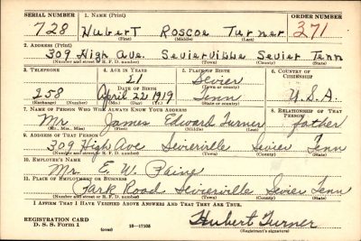 Hubert Roscoe Turner was born 23 April 1919 in Sevierville, Tennessee. He was the son of James Edward ‘Ed’ Turner and Nora G. Goforth.