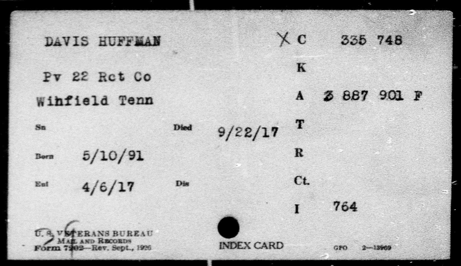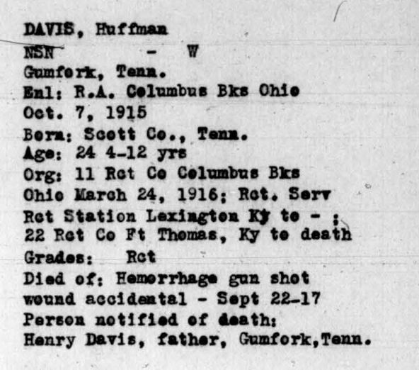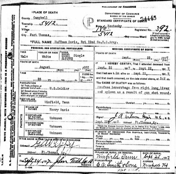 Huffman Davis died on 22 September 1917 at Fort Thomas, Campbell County, Kentucky due to profuse hemorrhage from the right lung, liver and spleen as a result of gun shot wound.