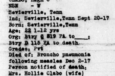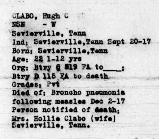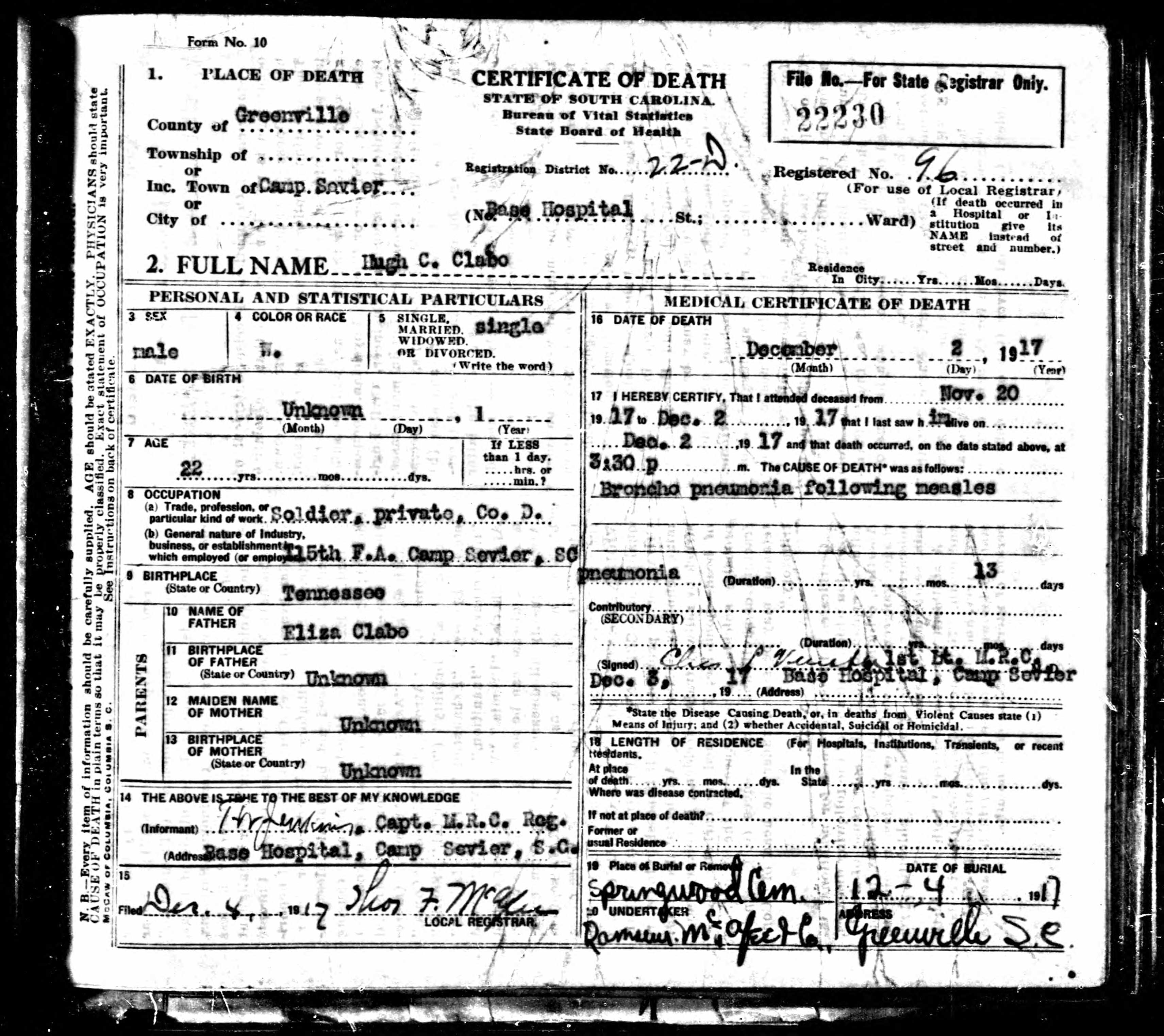 Died from Spanish Influenza Epidemic at the Base Hospital at Camp Sevier.