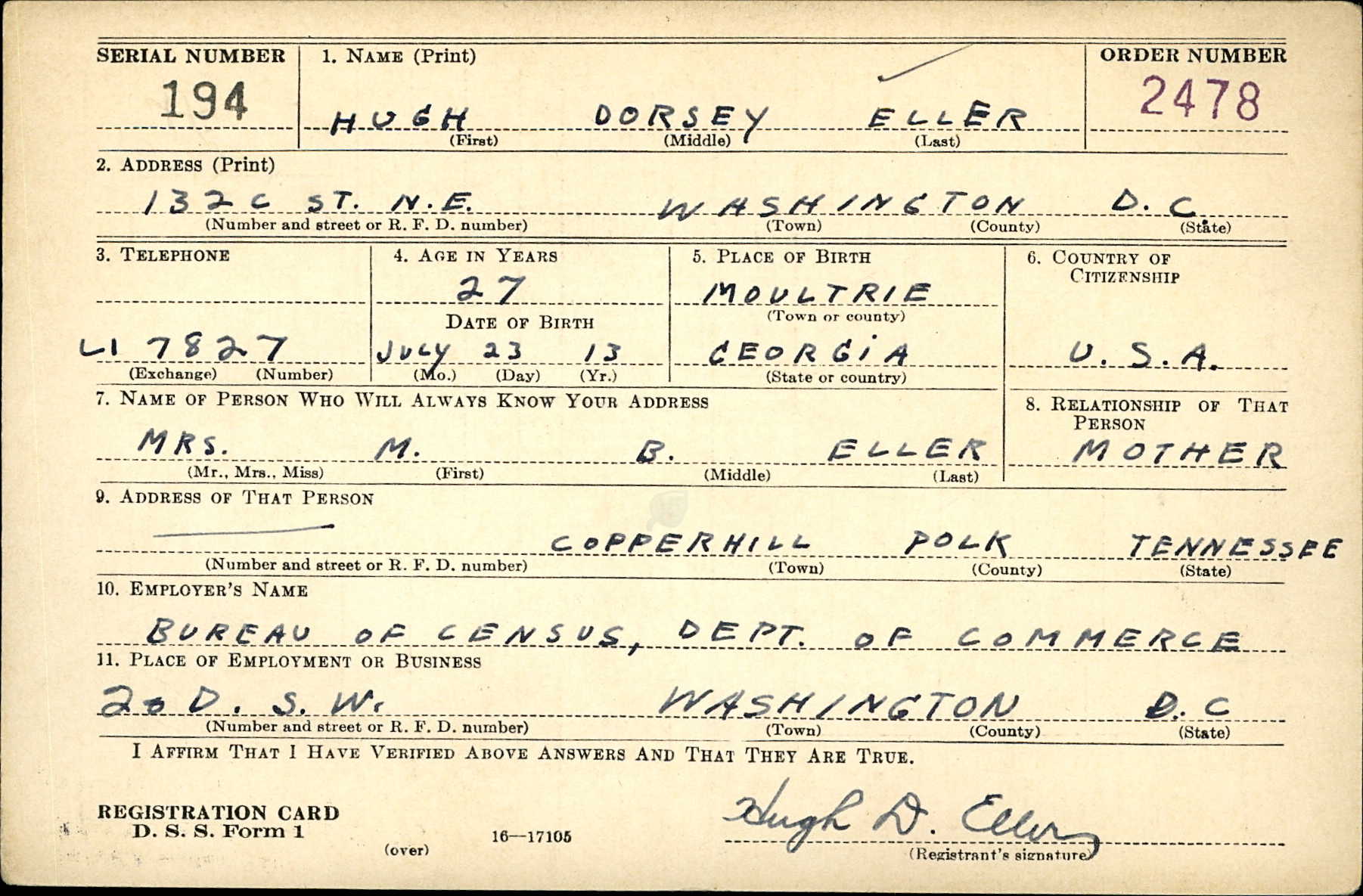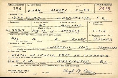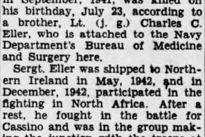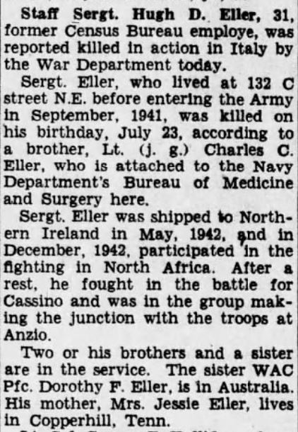 Staff Sergt. Hugh D. Eller, 31, former Census Bureau employe, was reported killed in action in Italy by the War Department today. Sergt. Eller, who lived at 132 C street N.E. before entering the Army in September, 1941, was killed on his birthday, July 23, according to a brother, Lt. (j.g.) Charles C. Eller, who is attached to the Navy Department’s Bureau of Medicine and Surgery here. Sergt. Eller was shipped to Northern Ireland in May, 1942, and in December, 1942, participated in the fighting in North Africa. After a rest, he fought in the battle for Cassino and was in the group making the junction with the troops at Anzio. Two of his brothers and a sister are in the service. The sister WAC Pfc. Dorothy F. Eller, is in Australia. His mother, Mrs. Jessie Eller, lives in Copperhill, Tenn.