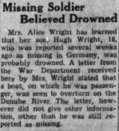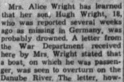 Mrs. Alice Wright has learned that her son, Hugh Wright, 18, who was reported several weeks ago as missing in Germany, was probably drowned. A letter from the War Department received here by Mrs. Wright stated that a boat, on which he was passenger, was seen to overturn on the Danube River. The letter, however did not give other information, other than he was still reported as missing.