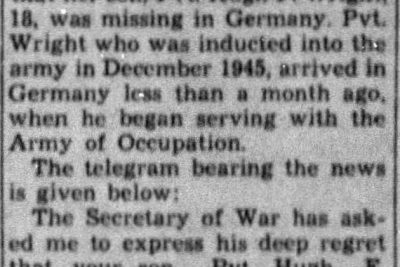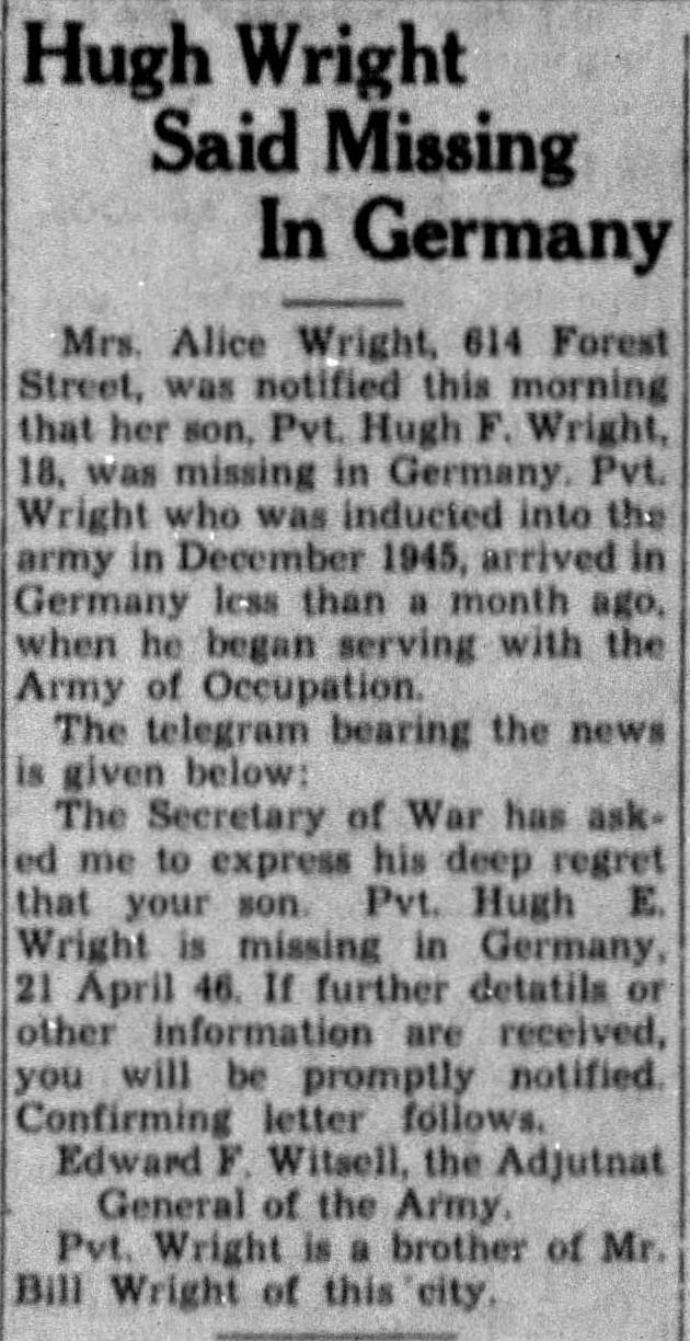 Mrs. Alice Wright, 614 Forest Street was notified this morning that her son, Pvt. Hugh F. Wright, 18, was missing in Germany. Pvt. Wright who was inducted into the army in December, 1945, arrived in Germany less than a month ago, when he began serving with the Army of Occupation. The telegram bearing the news is given as follows: The Secretary of War has asked me to express his deep regret that your son, Pvt. Hugh E. Wright is missing in Germany, 21 April 46. If further detals or other information are received, you will be promptly notified. Confirming letter follows.