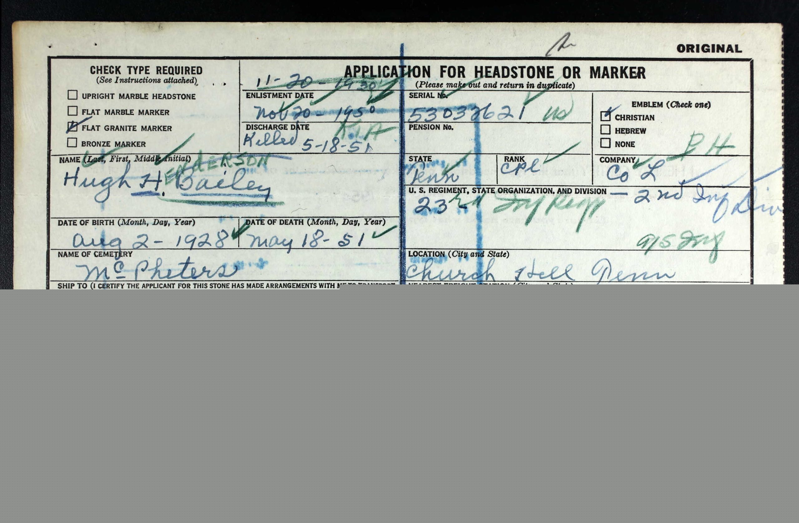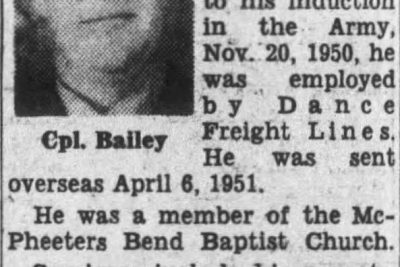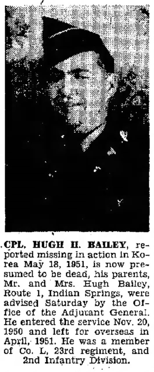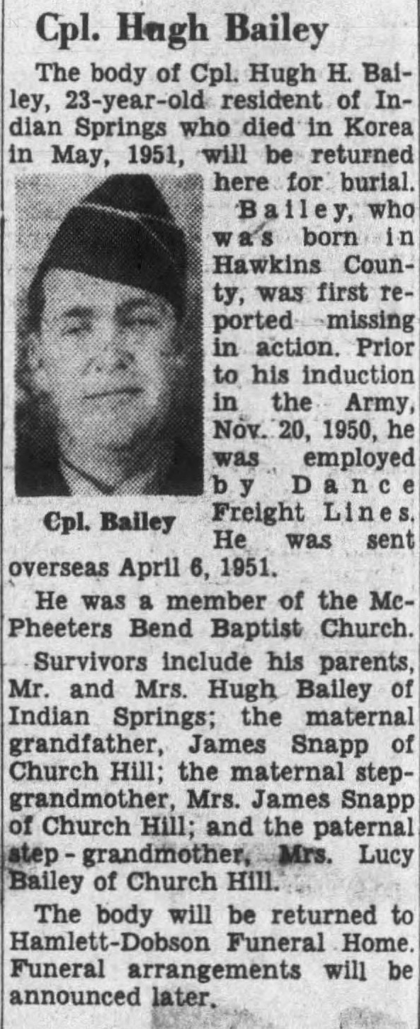 The body of Cpl. Hugh H. Bailey, 23-year-old resident of Indian Springs who died in Korea in May, 1951, will be returned here for burial. Bailey, who was born in Hawkins County, was first reported missing in action. Prior to his induction in the Army, Nov. 20, 1950, he was employed by Dance Freight Lines. He was sent overseas April 6, 1951.