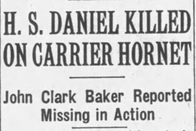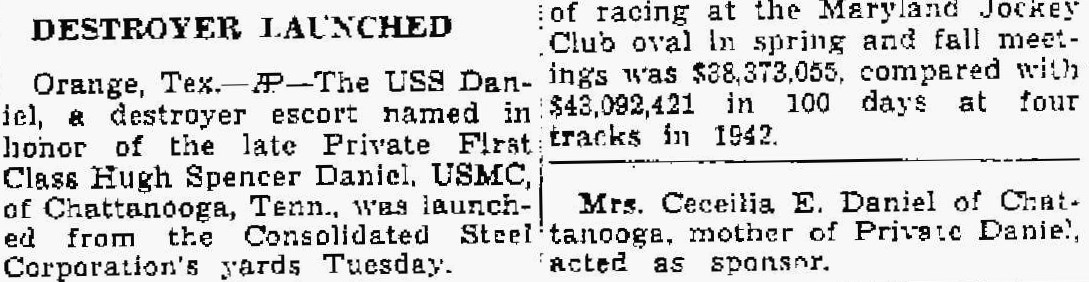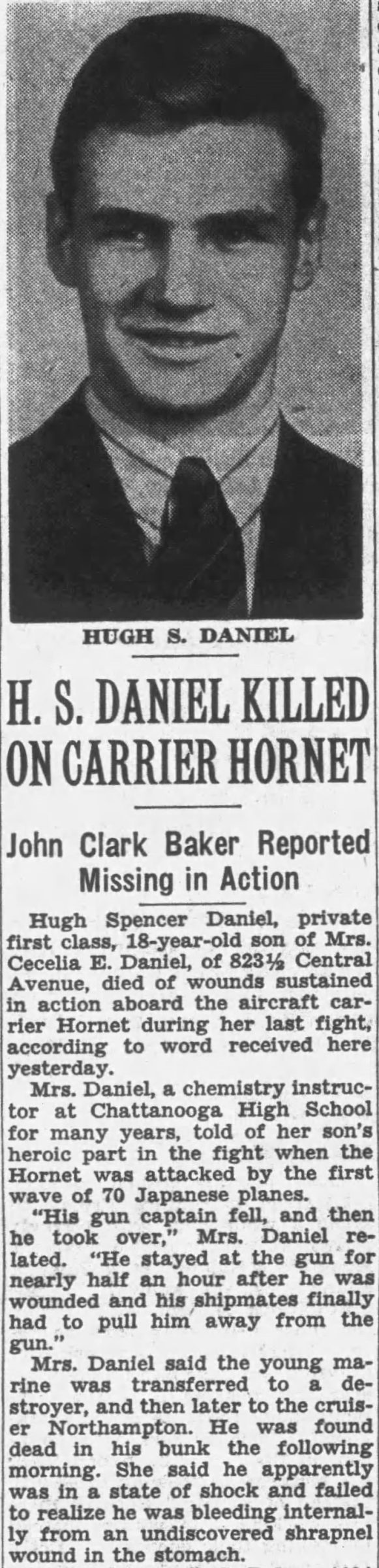 Hugh Spencer Daniel, private first class, 18-year-old son of Mrs. Cecelia E.Daniel, of 823½ Central Avenue, died of wounds sustained in action aboard the aircraft carrier Hornet during her last fight, according to word received here yesterday. Mrs. Daniel, a chemistry instructor at Chattanooga High School for many years, told of her sons’s heroic part in the fight when the Hornet was attacked by the first wave of 70 Japanese planes. “His gun captain fell, and then het ook over,” Mrs. Daniel related. “He stayed at the gun for nearly half an hou rafter he was wounded and his shipmates finally had to pull him away from the gun.” Mrs. Daniel said the young marine was transferred to a destroyer, and then later to the cruiser Northampton. He was found dead in hsi bunk the following morning. She said he apparently was in a state of shock and failed to realize he was bleeding internally from an undiscovered shrapnel wound in the stomach.
