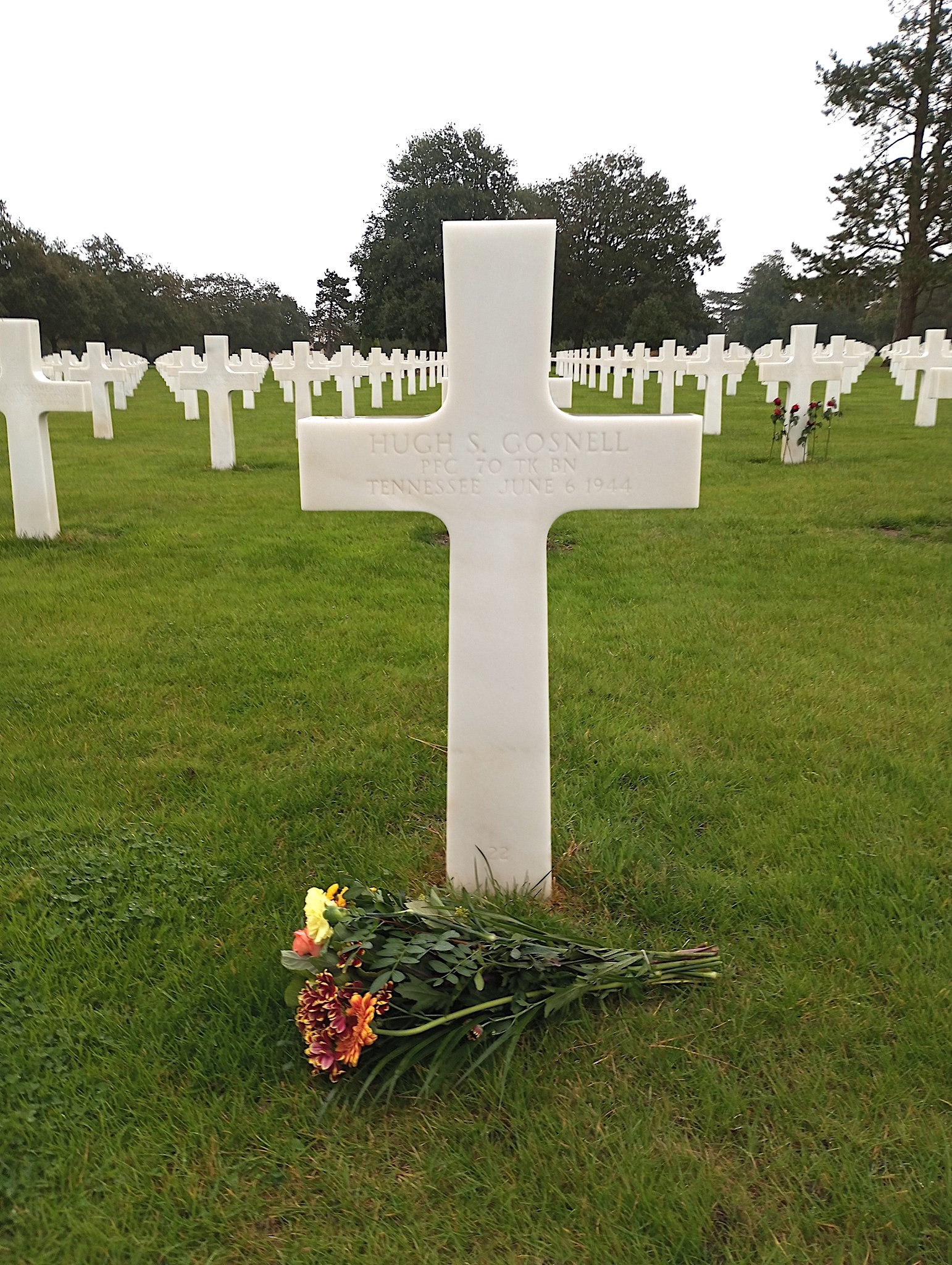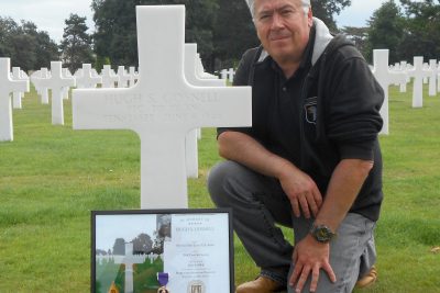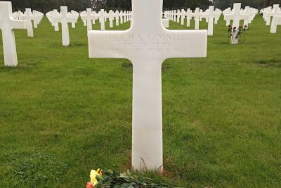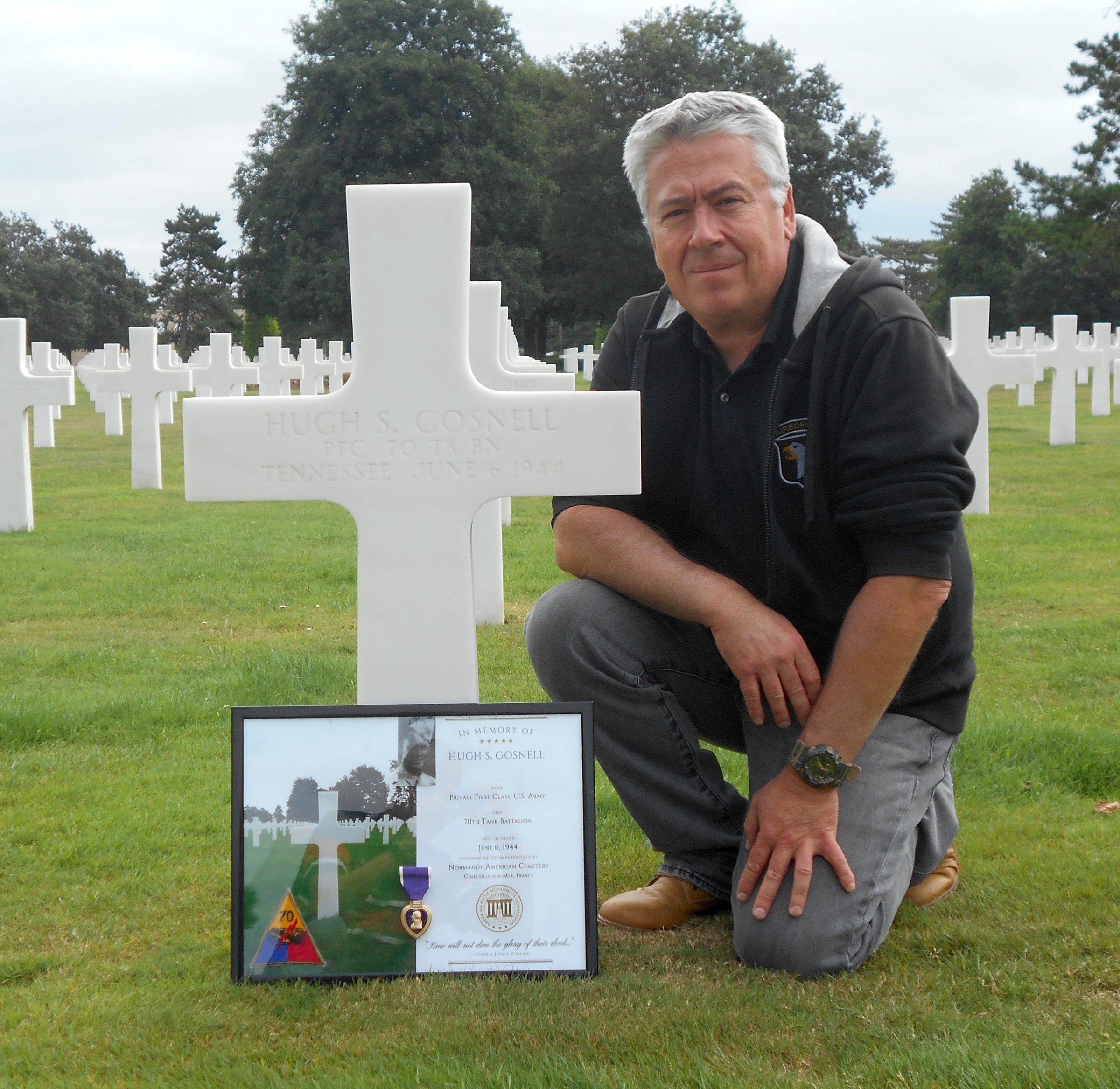(Monsieur Jacques Gressin takes care of Private First Class Hugh S. Gosnell’s grave at the Normandy American Cemetery in France. jacques.gressin@sfr.fr