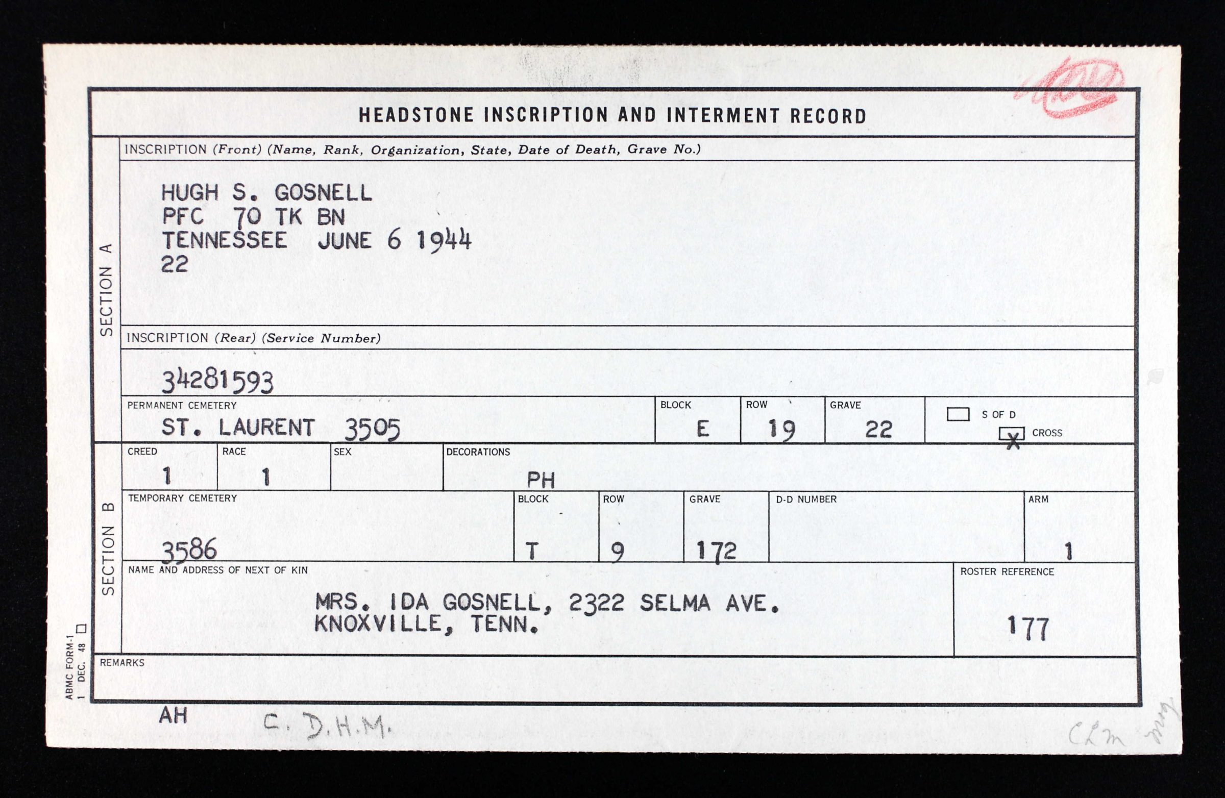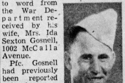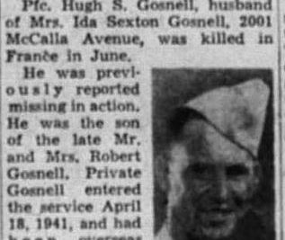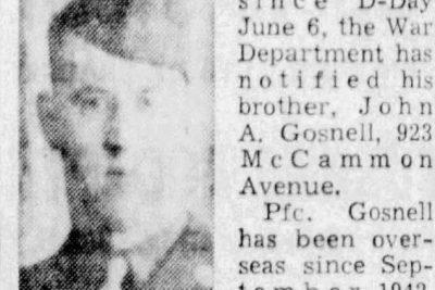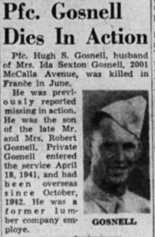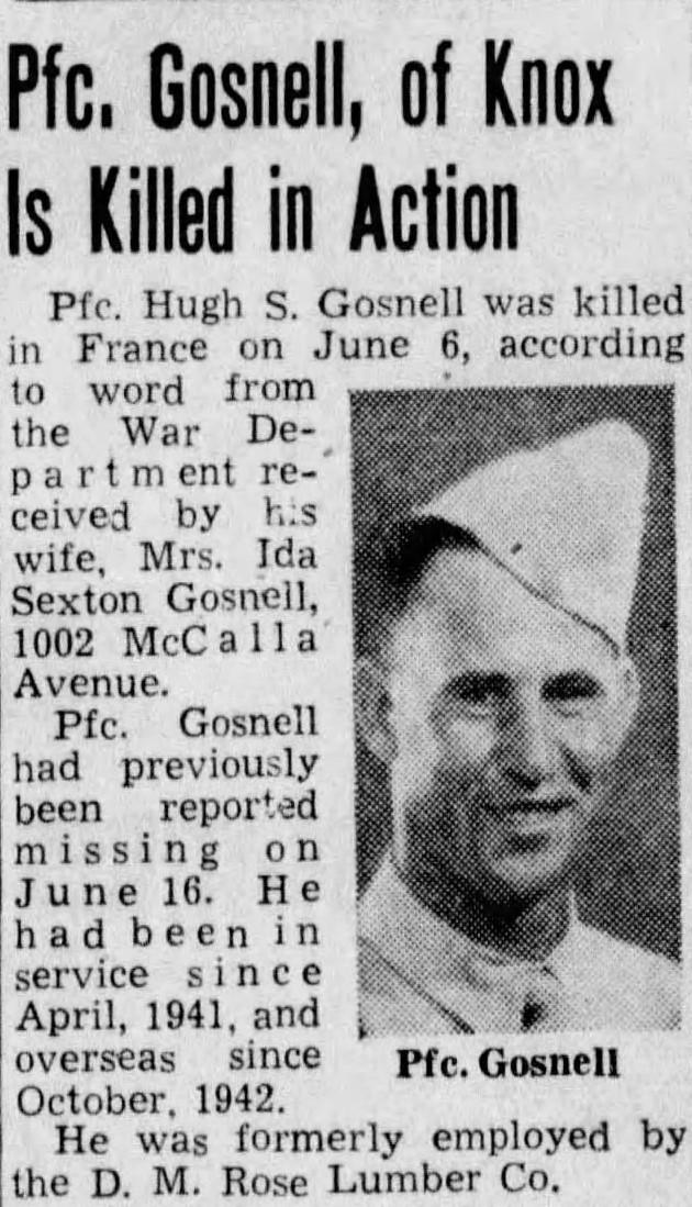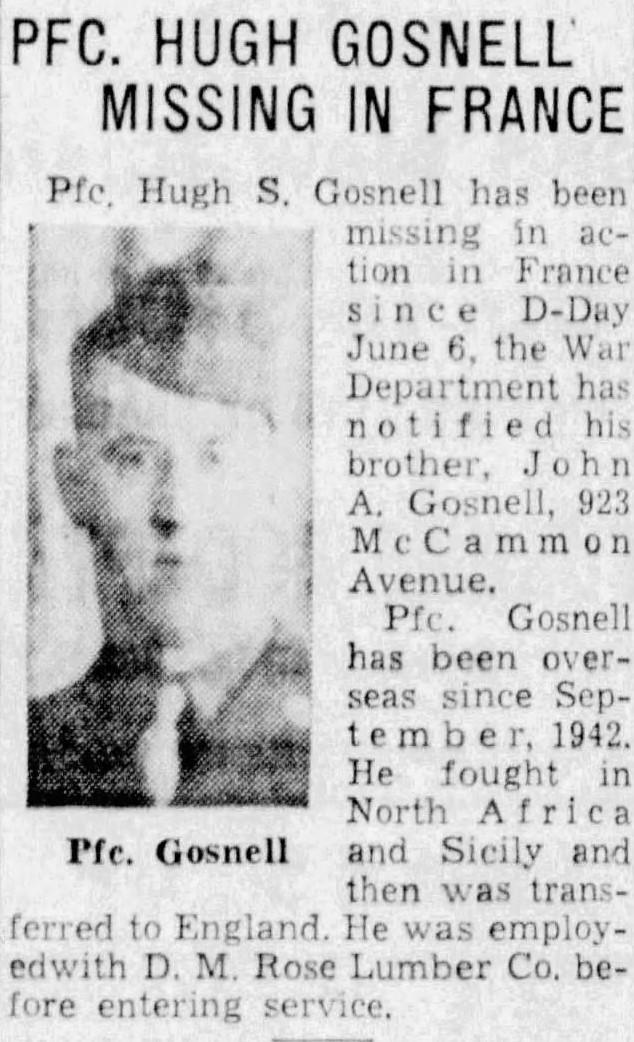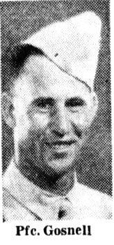 PFC Gosnell enlisted on April 18, 1941 and had been overseas since October 1942. He was killed in action on June 6, 1944 in France. He is buried at the Normandy American Cemetery in Colleville-sur-Mer, France