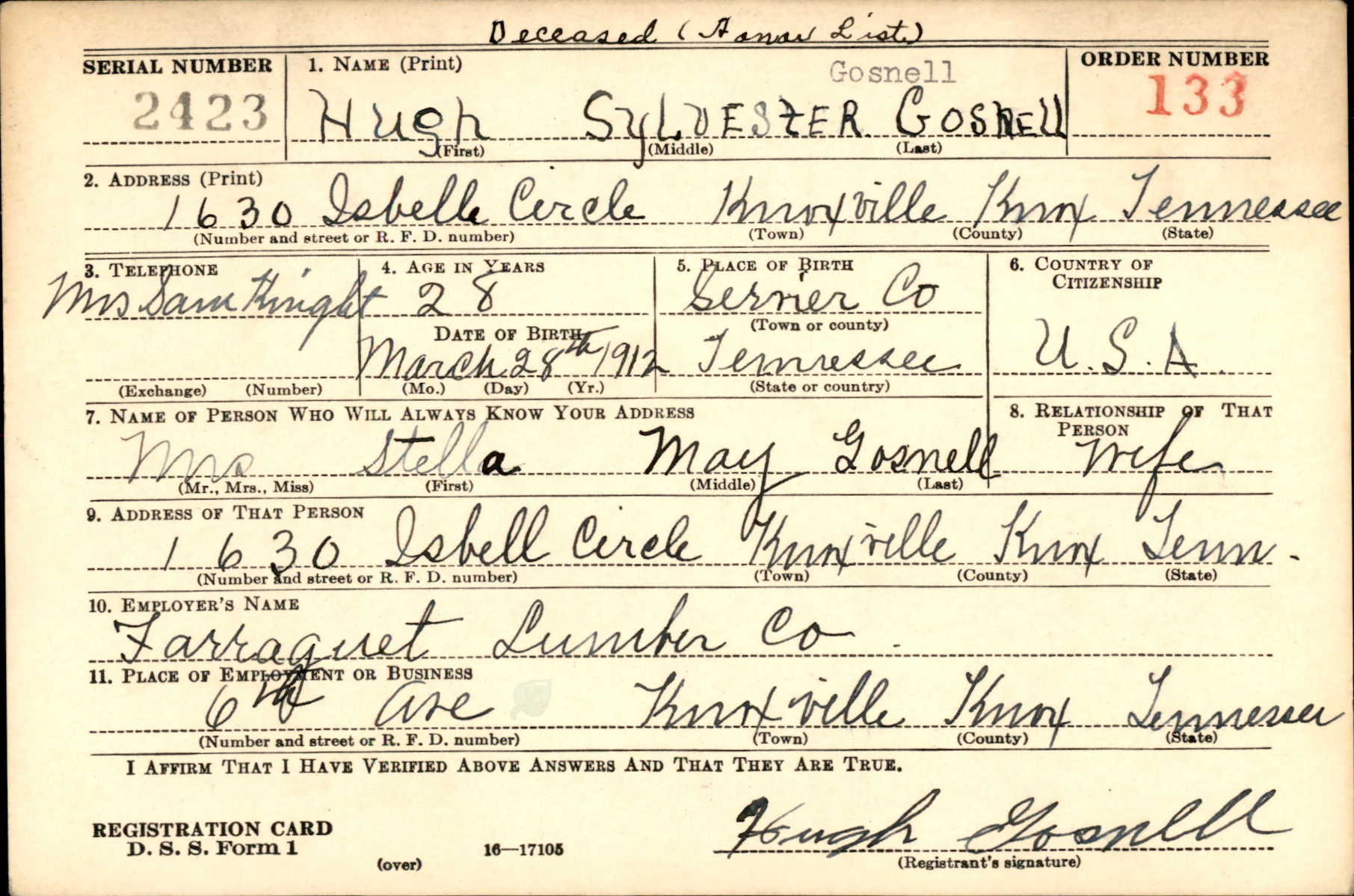 Hugh Sylvester Gosnell was born on March 28, 1912, in Sevier County, TN to Roderick Sylvester Gosnell and Elizabeth “Eliza” Baker. He was married to Stella Williams in April 1933. Siblings: James Pink Gosnell, Henry Henderson Gosnell, Melinda Mevina Gosnell, John Arthur Gosnell, Sherman Gosnell, Jessie Ellen Gosnell, and Josie May Cunningham Gosnell.