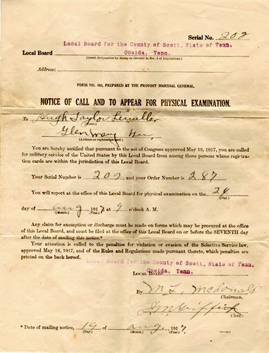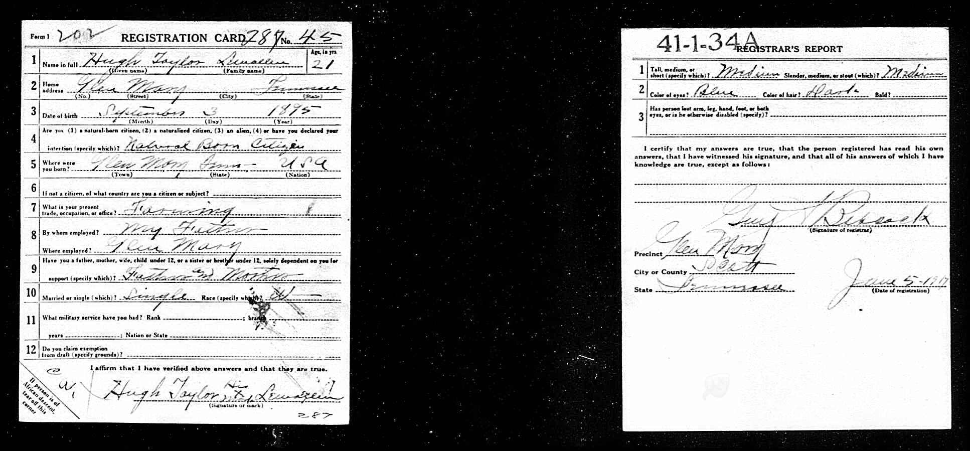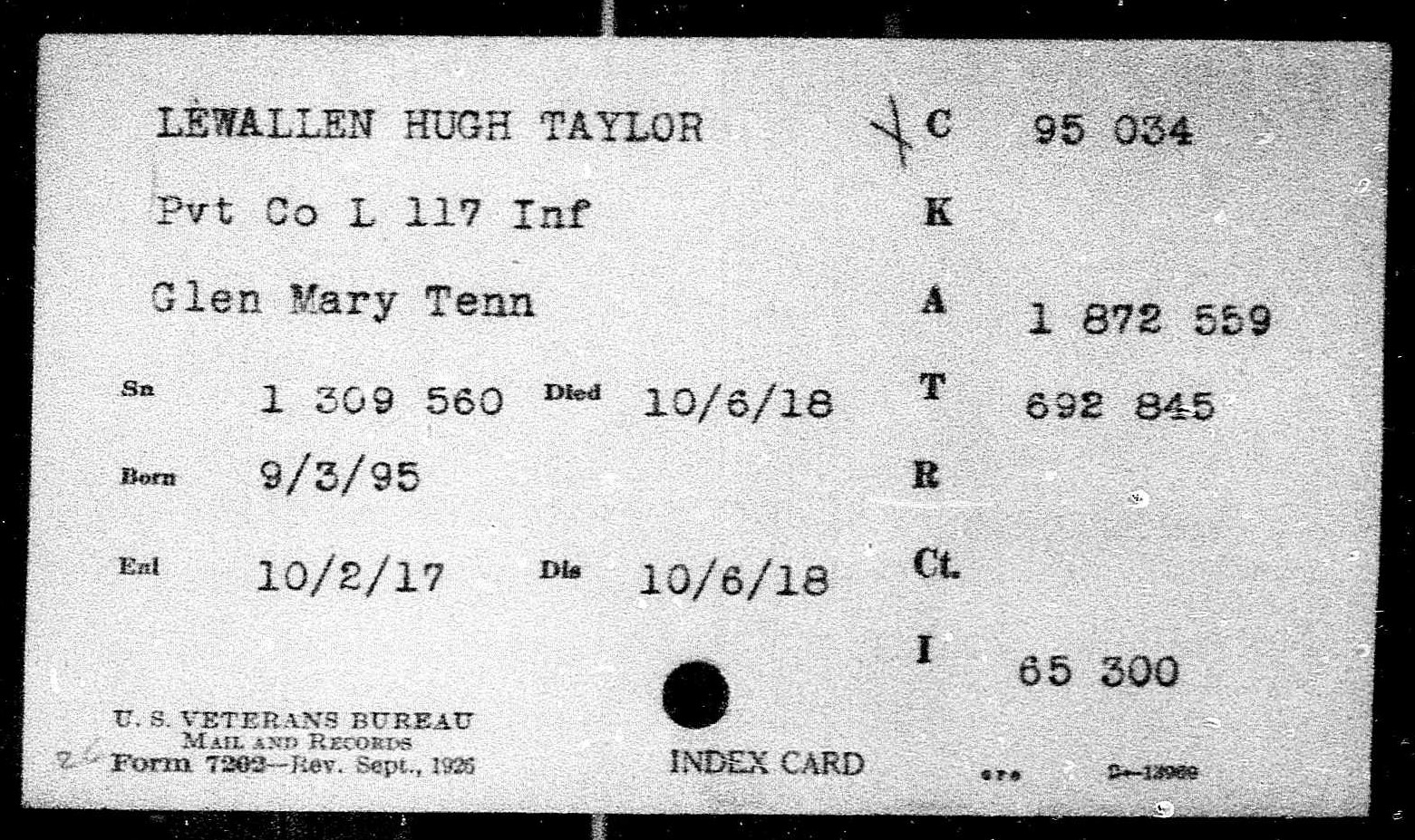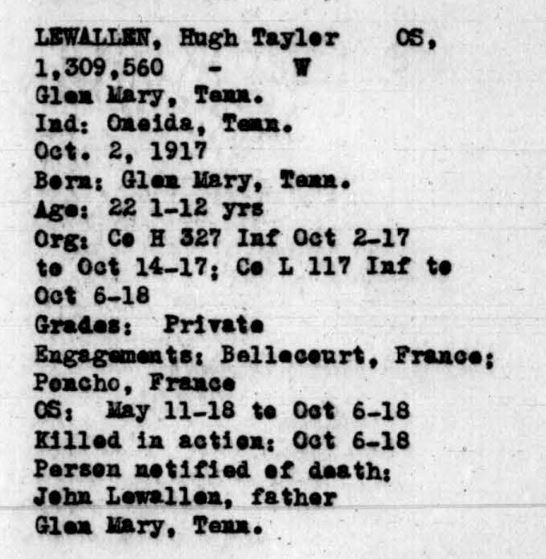 Hugh Taylor Lewallen was born 3 September 1895, Glenmary, Tennessee to John Harrison and Lydia Landrum Lewallen.