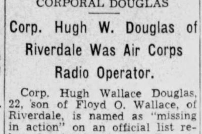Corp. Hugh Wallace Douglas, 22, son of Floyd O. Wallace, of Riverdale, is named as “missing in action” on an official list released today by the War Department. The list covers the Far Eastern theater including Australia and the South Pacific. Corporal Douglas, 22, was an air corps radio operator.