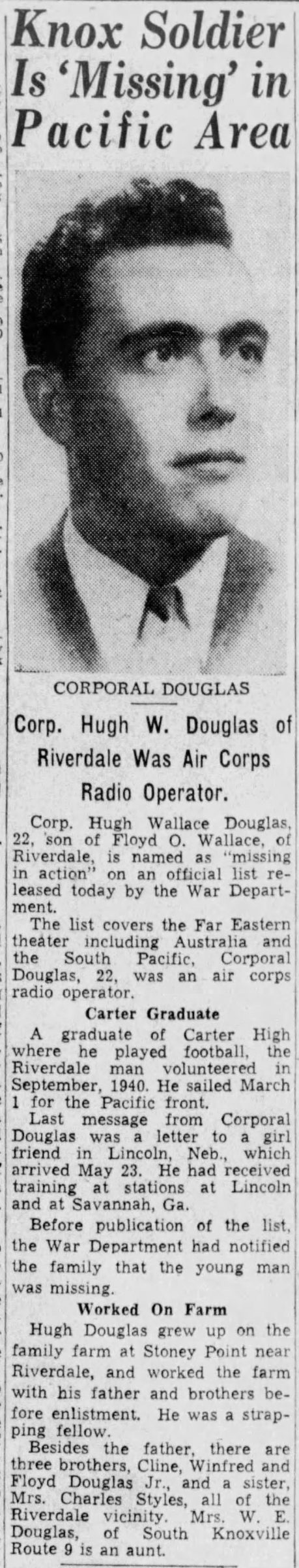 Hugh Douglas grew up on the family farm at Stoney Point near Riverdale, and worked the farm with his father and brothers before enlistment. He was a strapping fellow. Besides the father, there are three brothers, Cline, Winfred and Floyd Douglas Jr., and a sister, Mrs. Charles Styles, all of the Riverdale vicinity. Mrs. W.E. Douglas, of South Knoxville Route 9 is an aunt.