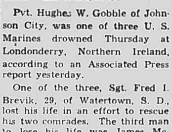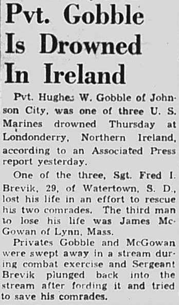 Pvt Hughes W. Gobble of Johnson City, was one of three U.S. Marines drowned thursday at Londonderry, Northern Island, according to an Associated Press report yesterday. One of the three, Sgt Fred I. Brevik, 29, of Watertown, S.D., lost his life in an effort to rescue his two comrades. The third man to lose his life was James McGowan of Lynn, Mass.