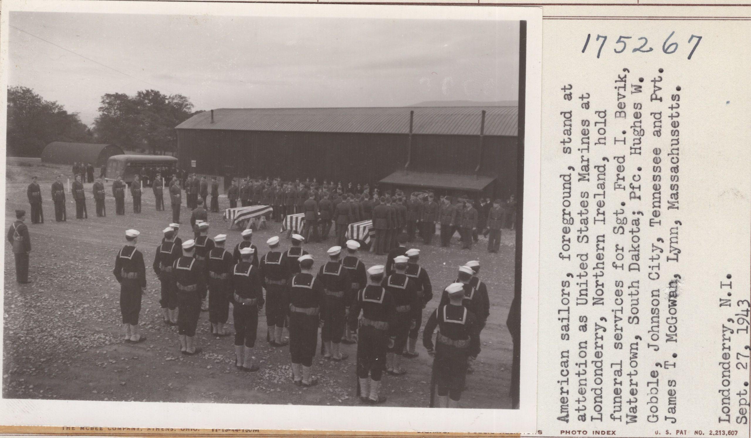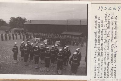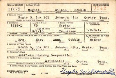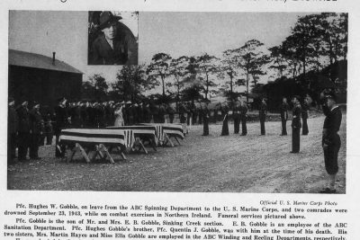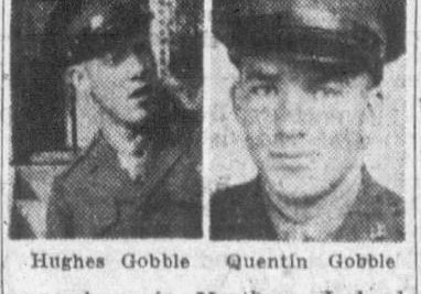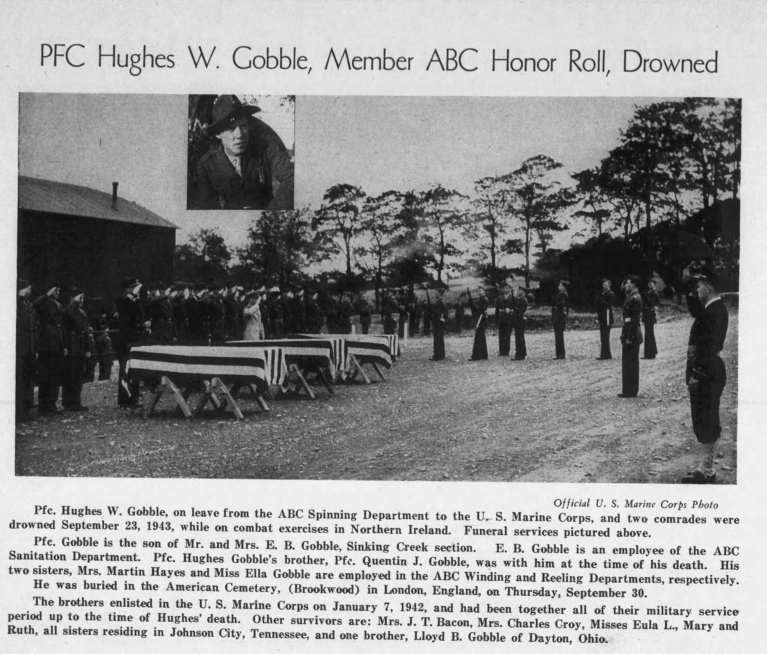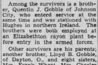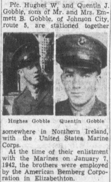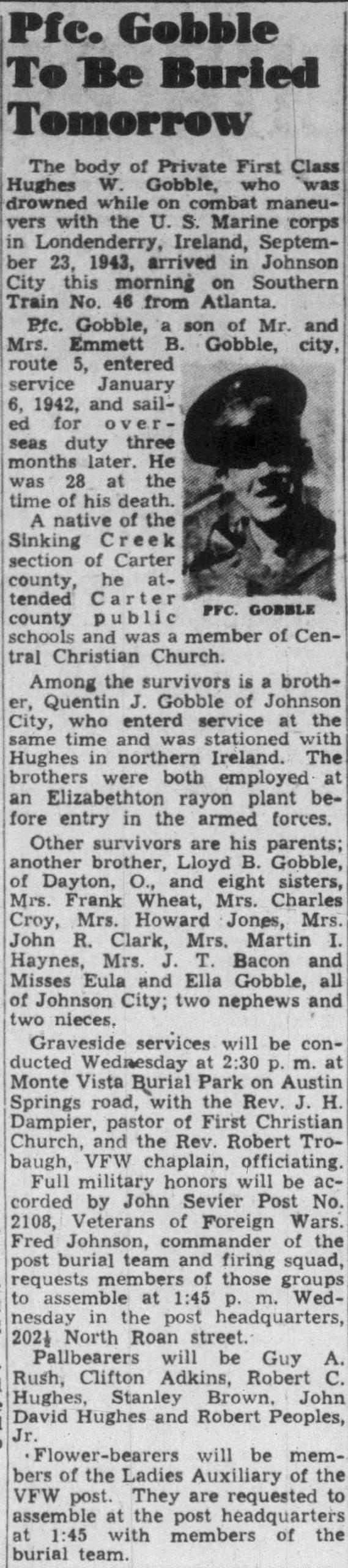 The body of Private First Class Hughes W. Gobble, who was drowned while on combat maneuvers with the U.S. Marine corps in Londenderry, Ireland, September 23, 1943, arrived in Johnson City this morning on the Southern Train No. 46 from Atlanta. Pfc. Gobble, a son of Mr. and Mrs Emmett B. Gobble, city, route 5, entered service January 6, 1942, and sailed for overseas duty three months later. He was 28 at the time of his death. A native of the Sinking Creek section of Carter county, he attended Carter county public schools and was a member of Central Christian Church. Among the survivors is a brother, Quentin J. Gobble of Johnson City, who entered service at the same time and was stationed with Hughes in northern Ireland. The brothers were both employed at an Elizabethton rayon plant before entry in the armed forces. Other survivors are his parents; another brother, Lloyd B. Gobble, of Dayton, O., and eight sisters, Mrs. Frank Wheat, Mrs. Charles Croy, Mrs. Howard Jones, Mrs. John R. Clark, Mrs. Martin I. Haynes, Mrs. J.T. Bacon and Misses Eula and Ella Gobble, all of Johnson City; two nephews and two nieces.