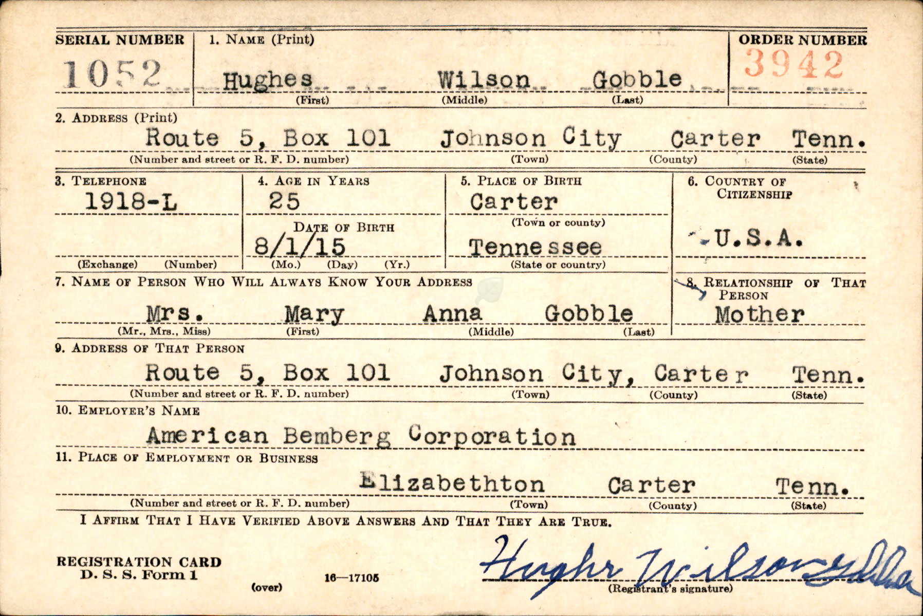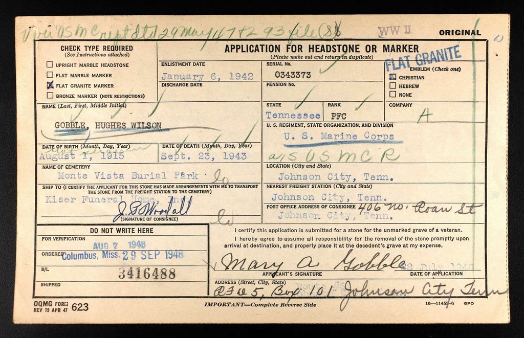 Hughes Wilson Gobble was born 1 August 1915 to Emmett Bradley Gobble and Mary “Mollie” Ann Hughes. His older brother, Lloyd B. Gobble, served in the United States Army during World War I and his younger brother Quentin J. Gobble enlisted on the same day with Hughes in the United States Marine Corps. They were assigned together and Quentin attended his funeral service at Brookwood American Cemetery, London, England. Pvt Gobble died 23 September 1943.