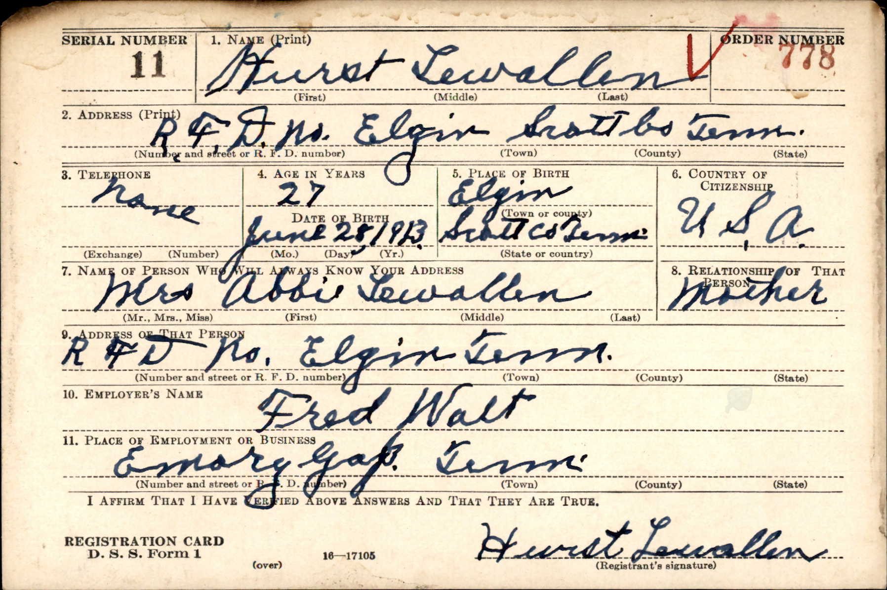 Hurst Lewallen was born on 28 June 1913 in Elgin, Tennessee, the son of Ulysses Matthew (Ulys) Lewallen and Abline Pemberton.