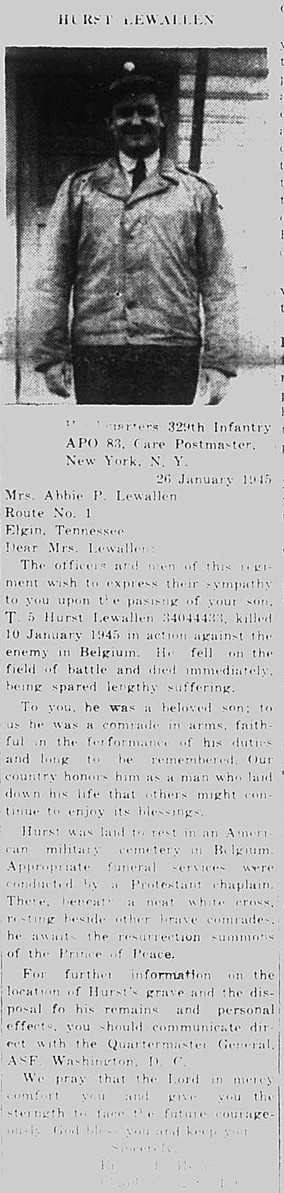 The office and men of this regiment wish to express their sympaghy to you upon the passing of your son, t5 Hurst Lewallen, 34044433, killed 10 January 1945 in action against the enemy in Belgium. He fell on the field of battle and died immediately being spared lengthy suffering. To you, he was a beloved son; to us he was a comrade in arms, faithful in the performance of his duties and long to be remembered. Our country honors him as a man who laid down his life that others might continue to enjoy its blessings. Hurst was laid to rest in an American military cemetery in Belgium. Appropiate funeral services were conducted by a Protestant chaplain, There, beneath a neat white cross, resting beside other brave comrades, he awaits the resurrection summons of the Prince of Peace. For further information on the location of Hurst’s Grave and the disposal of his remains and personal effects, you should communicate direct with the Quartermaster General, ASF Washington, D.C.