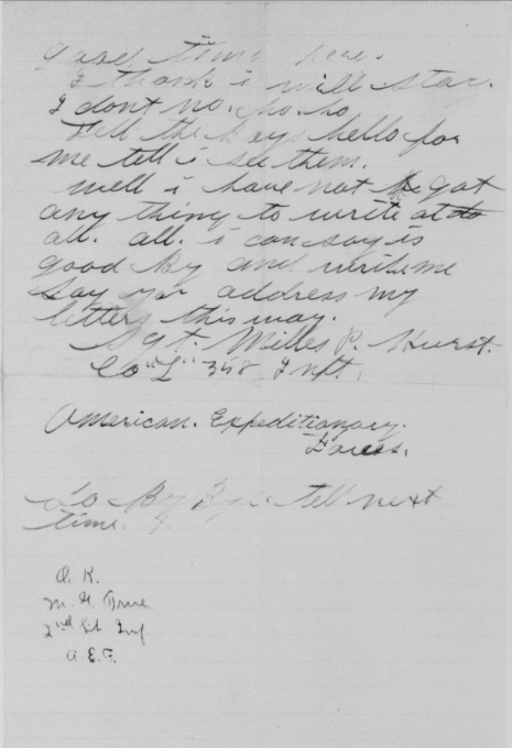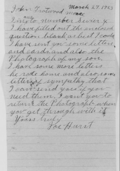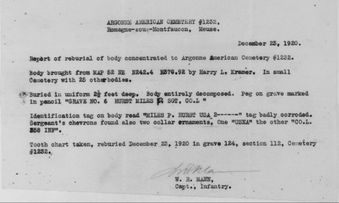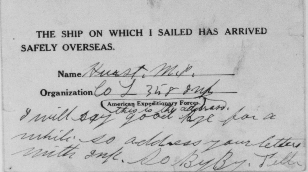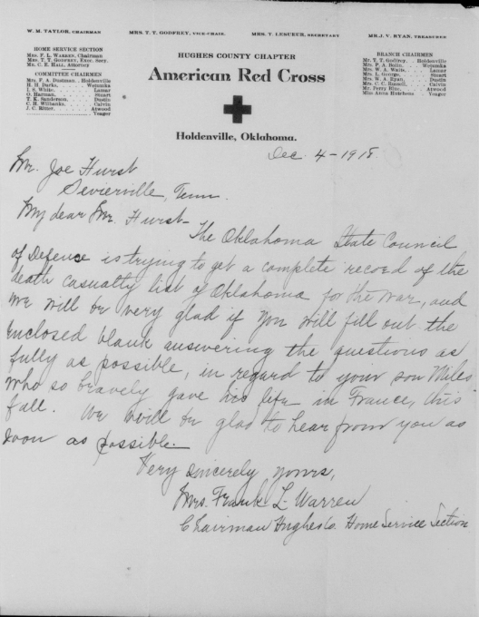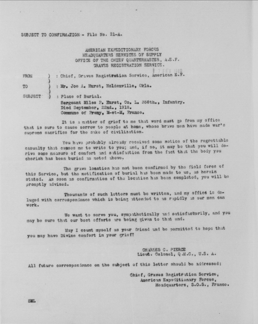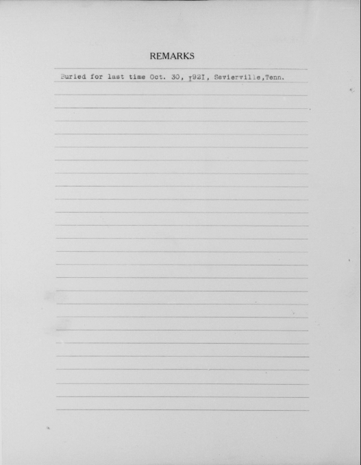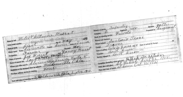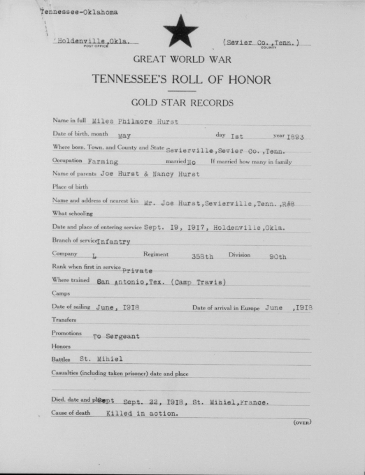 He resided at Holdenville, Hughes County, Oklahoma at the time of his enlistment on 19 September 1917. He trained at San Antonio, Texas and sailed for Europe late in June 1918. He was killed in action on 22 September 1918 at St-Mihiel, France and initially buried in a small cemetery at the commune of Preny in France and reburied in 1920 at the Argonne American Cemetery #1232. He was returned home in 1921 where he was buried on 30 October at Sevierville, TN.