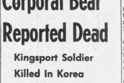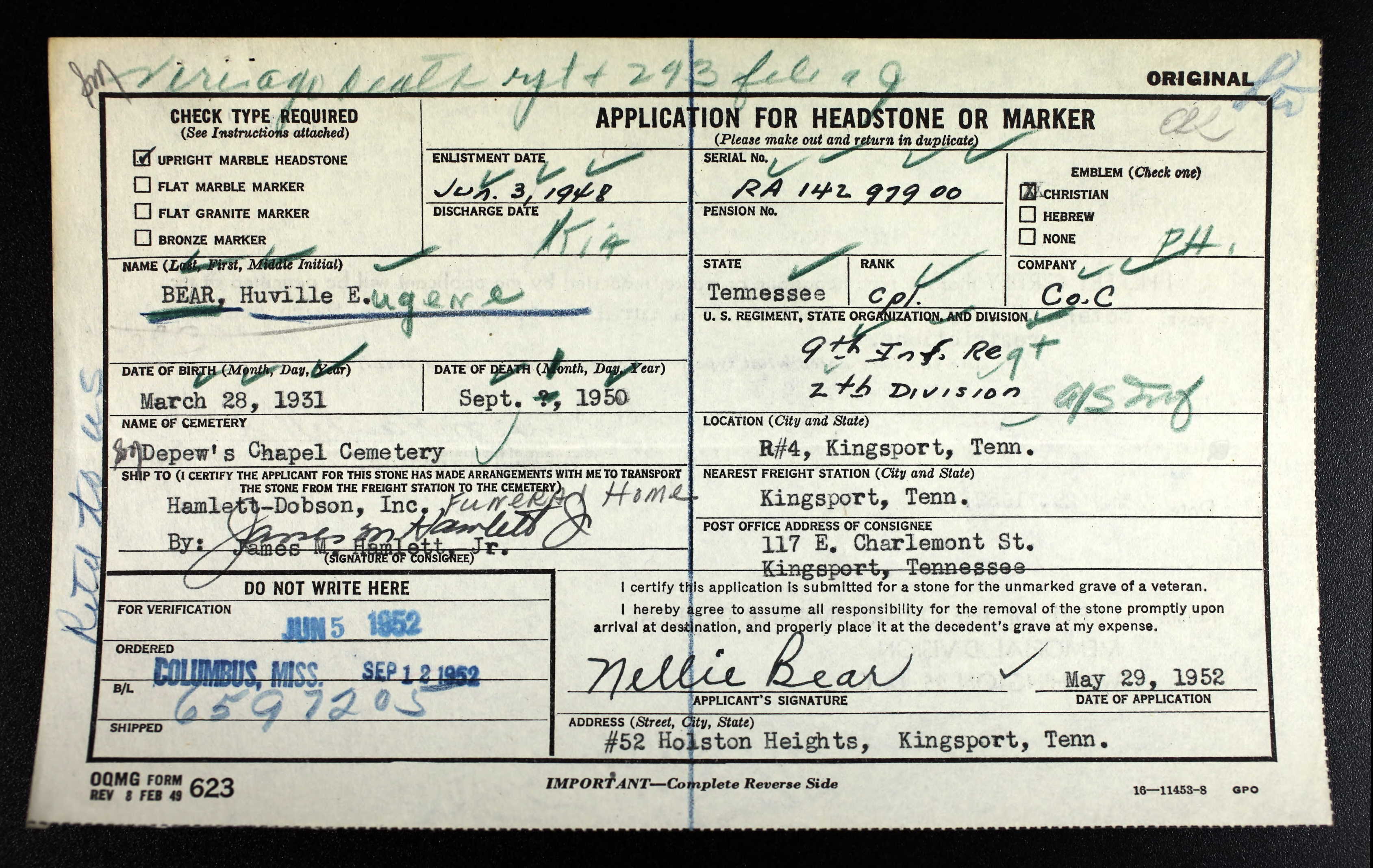 Corporal Huville E. Bear, who was previously reported missing in action in Korea, has been declared killed in action, according to an announcement released Monday by the United States Department of Defense. The son of Mr. and Mrs. David C. Bear, 52 Holston Heights, Cpl. Bear, 20, entered service four years ago. He was sent to Korea in July, 1950, and was reported missing in September of that year. He was born March 28, 1931, in Kingsport, and lived here until the time of his induction. He attended Jackson School and Junior High School. Besides his parents he is survived by the following; five sisters, Mrs. Clyde Carter, Churh Hill, Mrs. Velma Kerney, Vernon Heights, Mrs. John Messersmith, York, Pa., Miss Helen Bear and Miss Patsy Bear, Kingsport; three brothers, Arthur, Joseph and Worley, all of Kingsport. One brother, Joseph, is in the United States Air Force, and is now stationed in Louisiana.