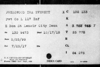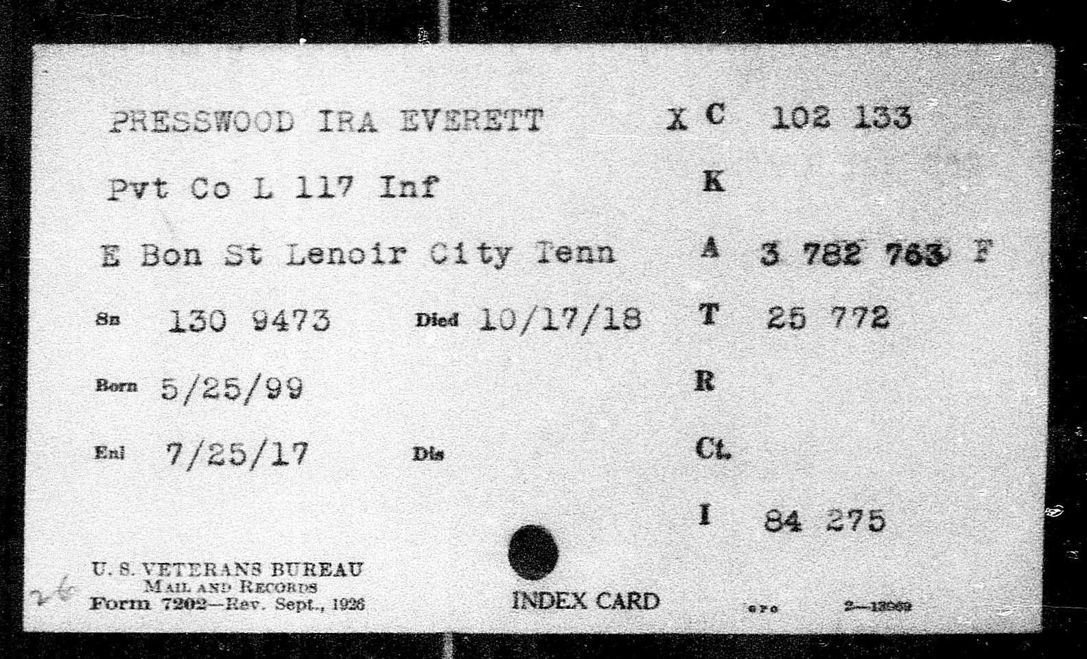 Ira Everette Presswood was born in Sweetwater, Tennessee. He died at the age of 18. Ira served with Company L, 117th Infantry Regiment, 30th Division. He was killed in action at Düring, Cuxhaven, Niedersachsen, Germany.