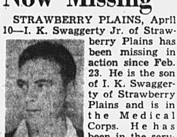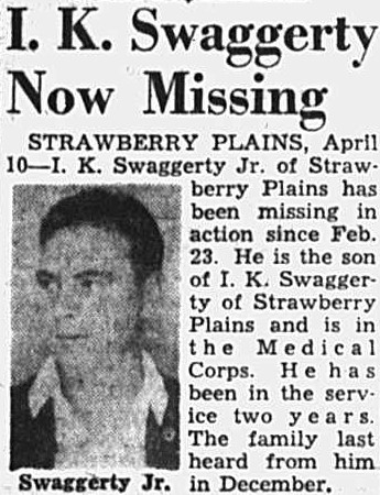 Strawberry Plain, April 10 – I.K. Swaggerty Jr. of Strawberry Plains has been missing in action since Feb. 23. He is the son of I.K. Swaggerty of Strawberry Plains and is in the Medical Corps. He has been in the service two years. The family last heard from him in December.