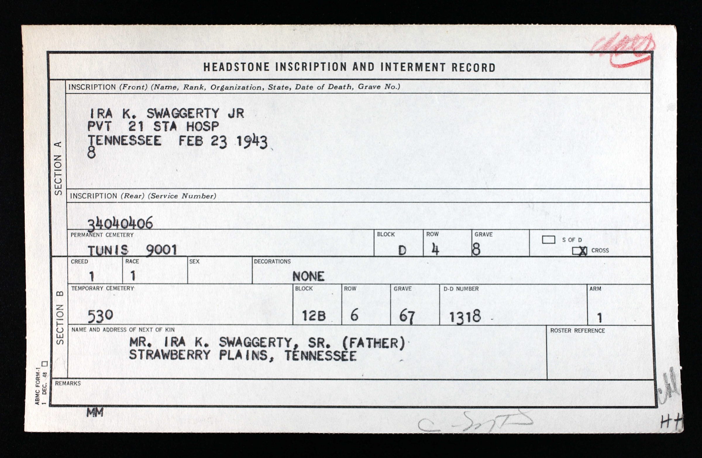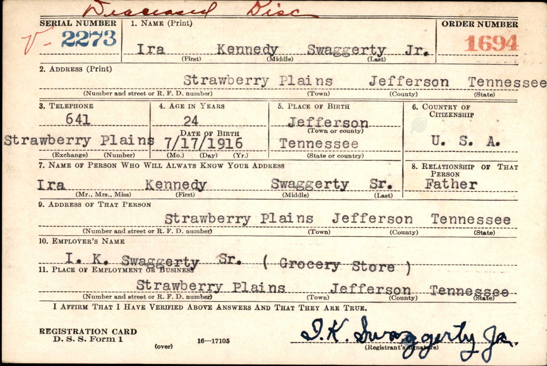 Ira Kennedy Swaggerty Jr. was born in 1917 and the son of Ira Kennedy Swaggerty and Octavia Mae Cate. He Died Non Battle