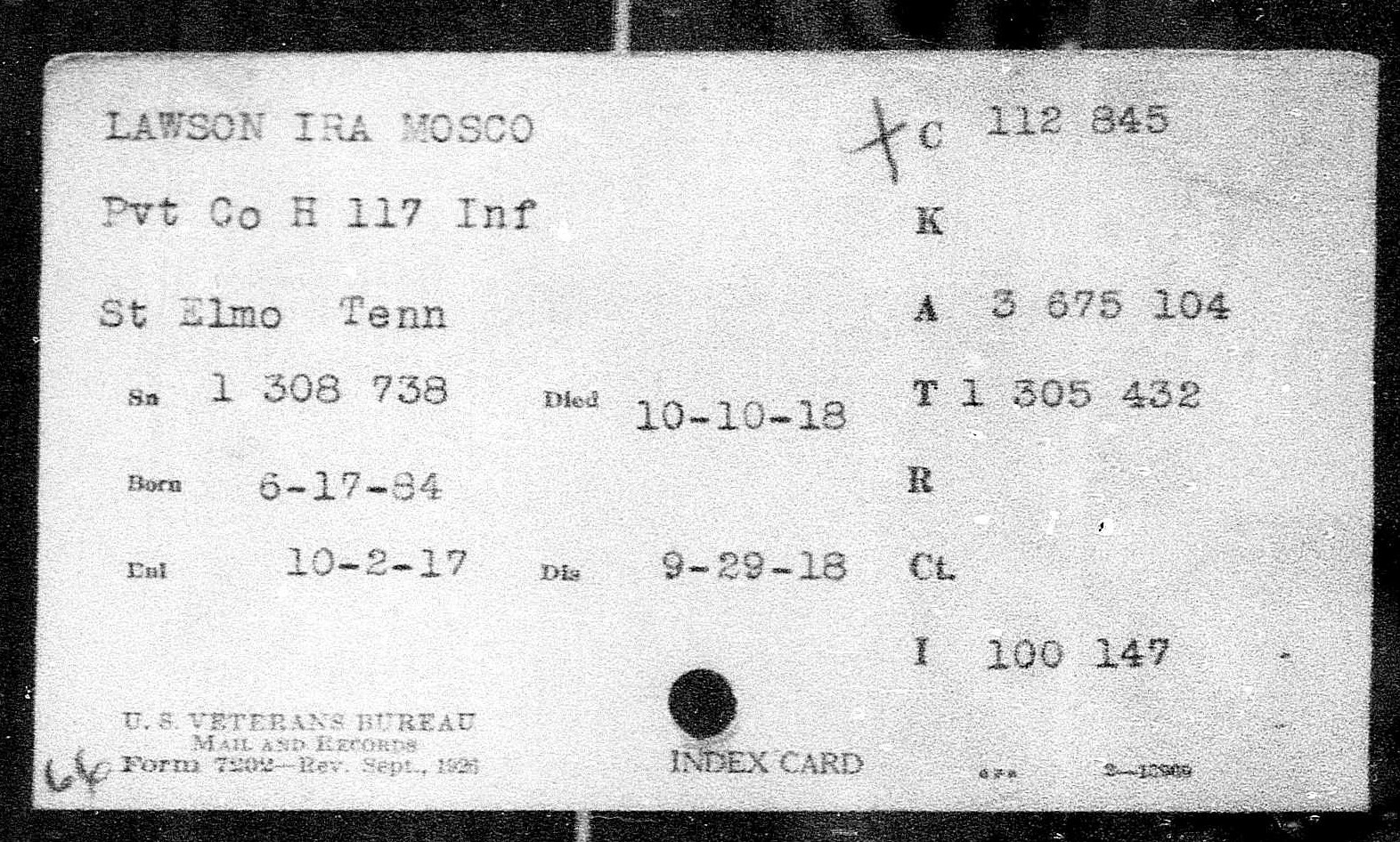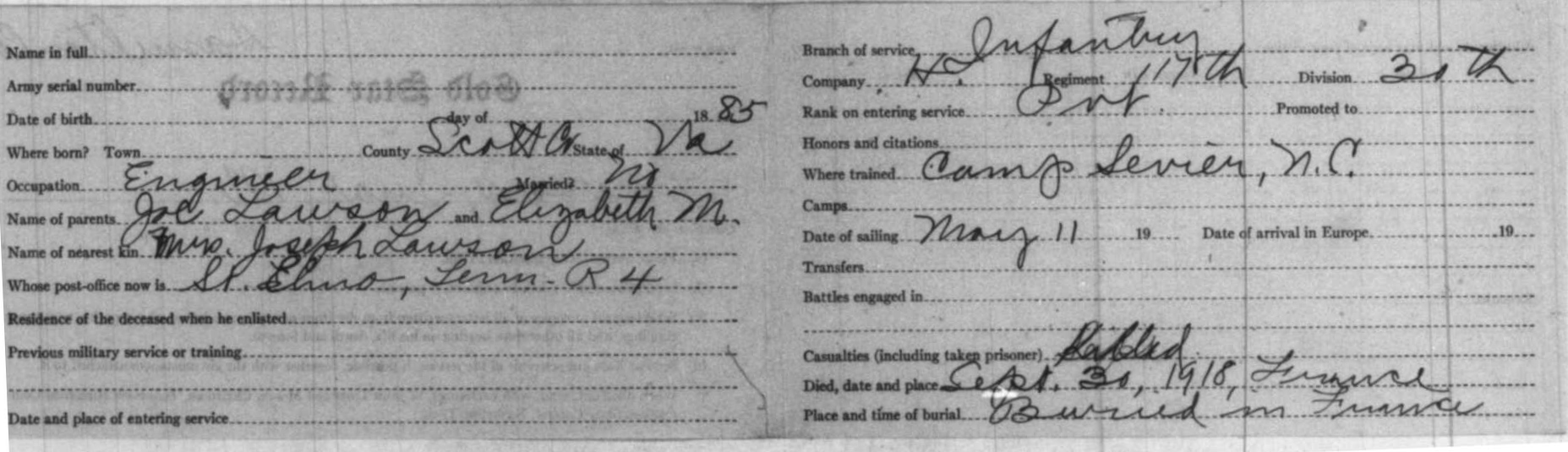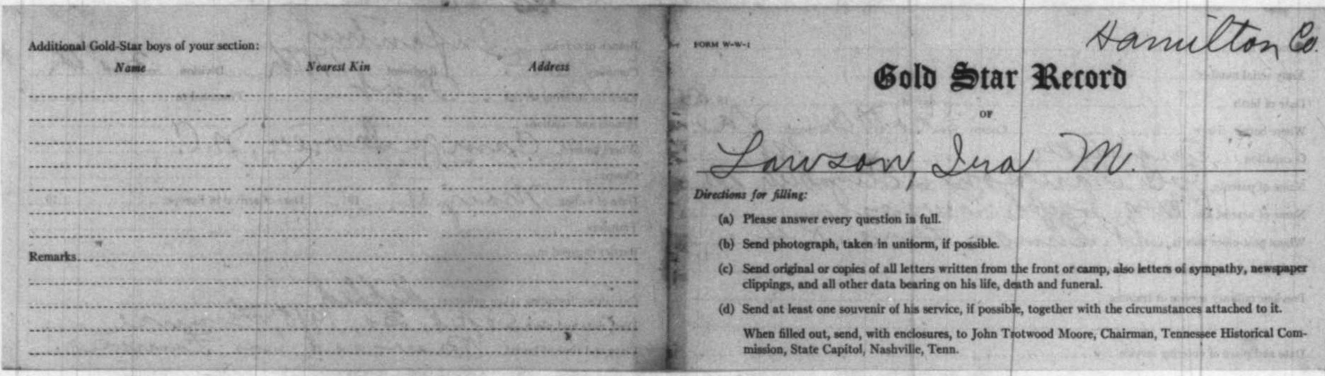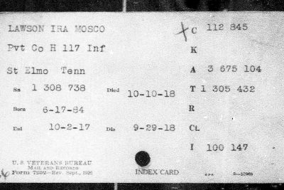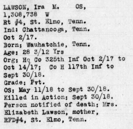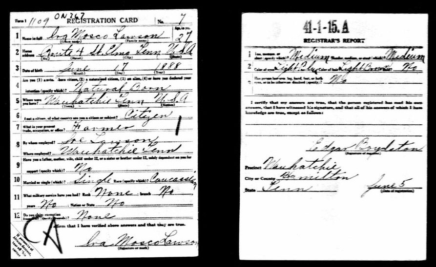 Ira Mosco Lawson was born on 17 June 1888 at Watatchie, Hamilton County, Tennessee, son of Elizabeth Lawson