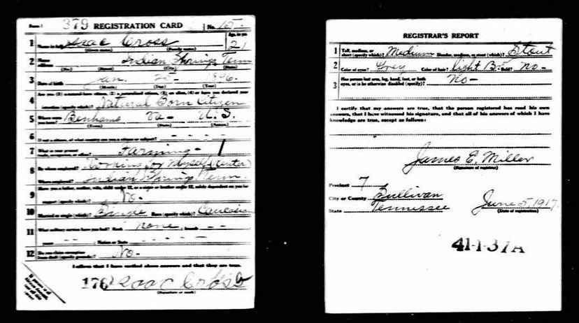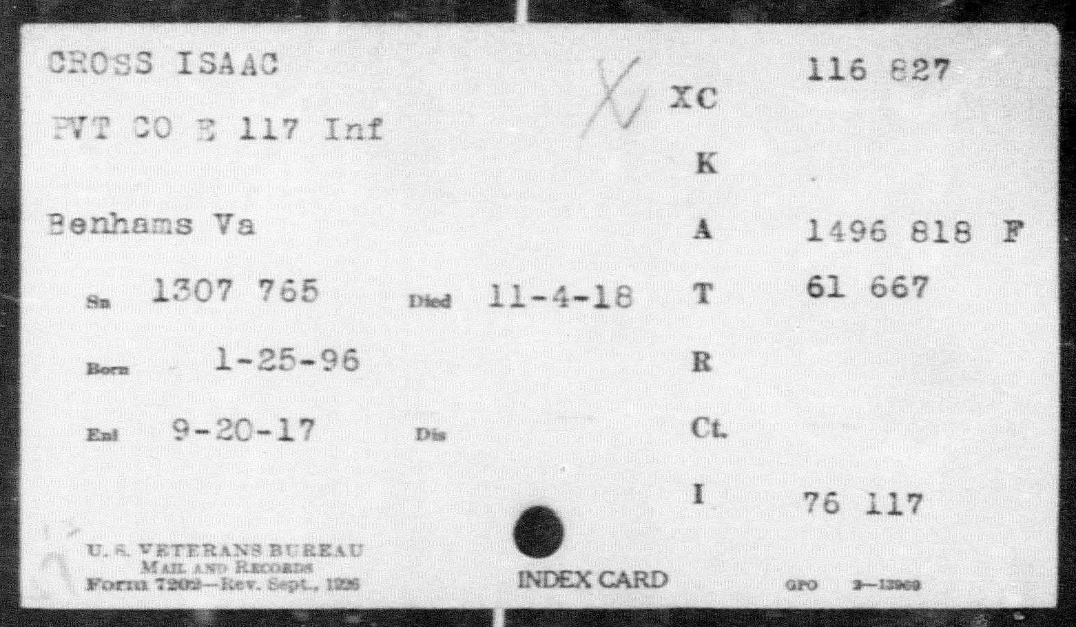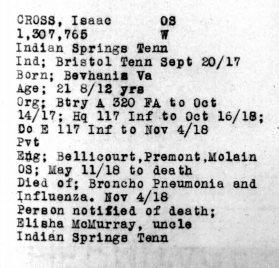 Isaac Cross was born 25 January 1896, Bethany, Virginia to William A. Cross and Martha Kidd Shaffer. He resided at Indian Springs, Sullivan County, Tennessee. Pvt Cross died 4 November 1918 of broncho pneumonia and influenza in France.