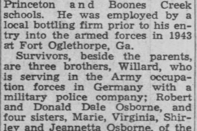 Survivors, beside the parents, are three brothers, Willard, who is serving in the Army occupation forces in Germany, with a military police company; Robert and Donald Dale Osborne, and four sisters, Marie, Virginia, Shirley and Jeannetta Osborne, of the Marbleton community. Also surviving is the paternal grandfather, Alexander Osborne, of the Buffalo section of Unicoi County.