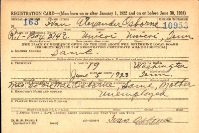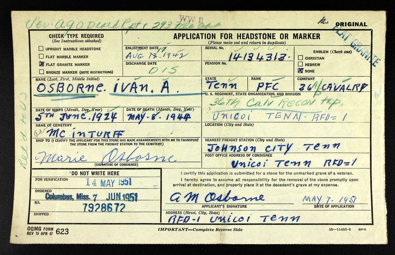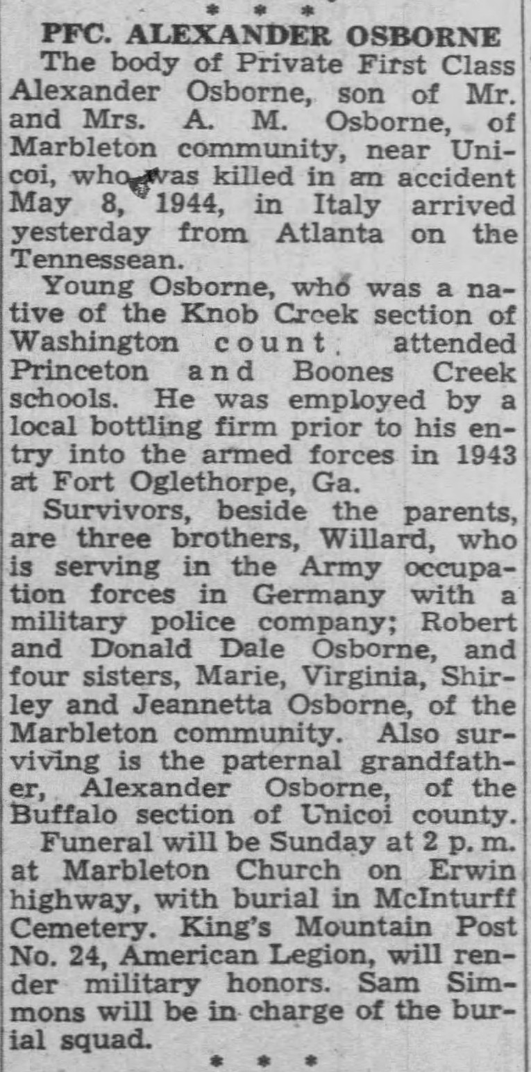 The body of Private First Class Alexander Osborne, son of Mr. and Mrs. A.M. Osborne, of Marbleton community, near Unicoi, was killed in an accident May 8, 1944, in Italy arrived yesterday from Atlanta on the Tennessean. Young Osborne, who was a native of the Knob Creek section of Washington county, attended Princeton and Boones Creek school. He was employed by a local bottling firm prior to his entry into the armed forces in 1943 at Fort Oglethorpe, Ga.