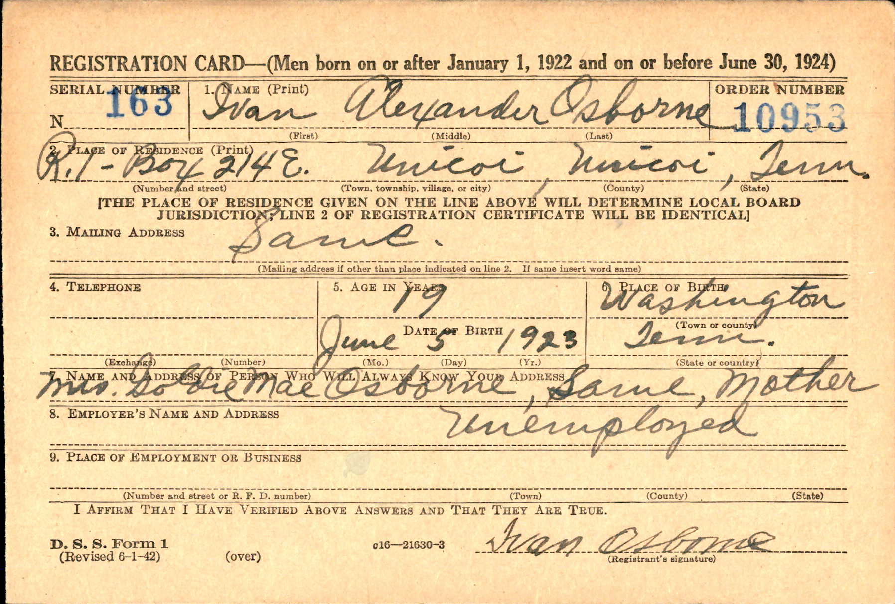 Ivan Alexander Osborne was born on 5 June 1924 in Piney Flats, Tennessee to Alonzo Melton Osborne and Goldie Mae Hodges.