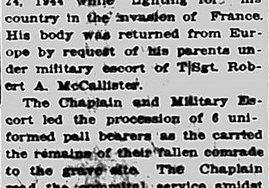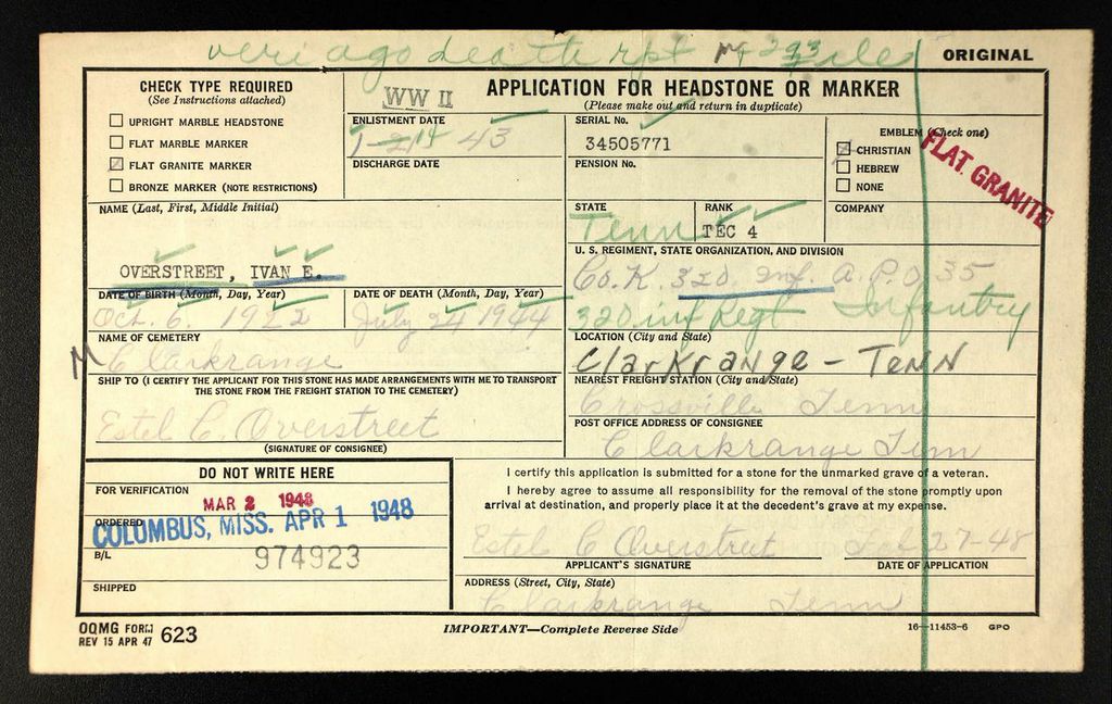 Sgt. Overstreet was killed July 24, 1944 while fighting for his country in the invasion of France. His body was returned from Europe by request of his parents under military escort of T/Sgt Robert A. McCallister.