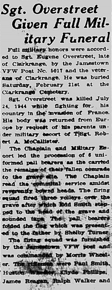 Full military honors were accorded to Sgt. Eugene Overstreet, late of Clarkrange by the Jamestown VFW Post no. 5017 and the veterans of Clarkrange. He was buried Saturday, February 21st at the Clarkrange Cemetery.