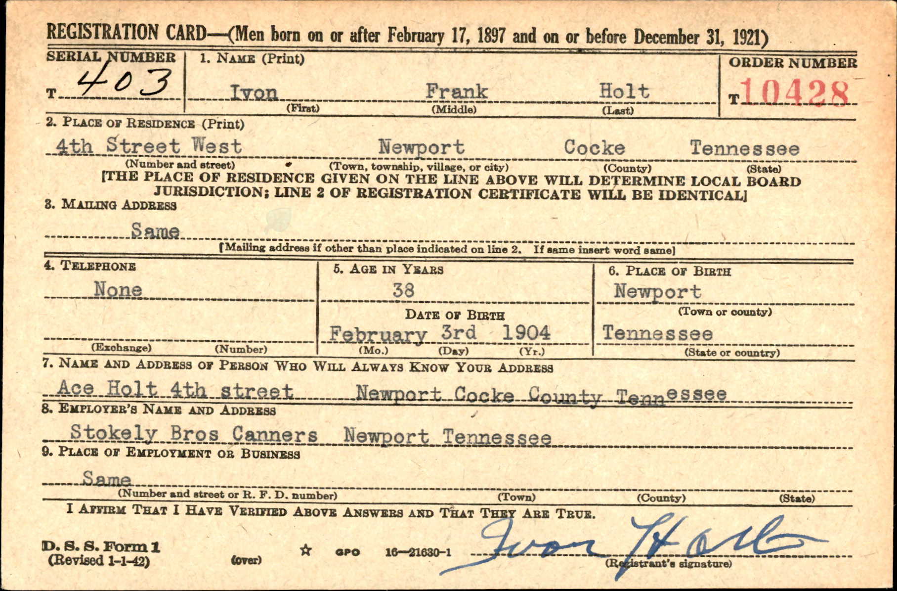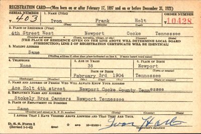 Ivan Frank Holt was born at Newport in Tennessee to Ace Holt and Allie Shaver.