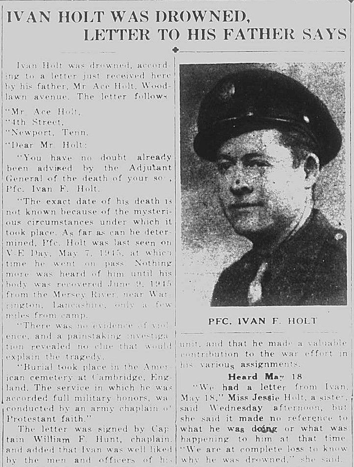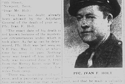 Ivan Holt was drowned, according to a letter just received here by his father, Mr. Ace Holt, Woodlawn Avenue. The letter follow: “Dear Mr. Holt, You have no doubt already been advised by the Adjutant General of the death of your son, Pfc. Ivan F. Holt. The exact date of his death is not known because of the mysterious circumstances under which it took place. As far as can be determined, Pfc. Holt was last seen on V.F. Day, May 7, 1945, in which time he went on pass. Nothing more was heard of him until his body was recovered June 9, 1945 from the Mersey River near Warrington, Lancashire, only a few miles from camp. There was no evidence of violence, and a painstaking investigation revealed no clue that would explain the tragedy.