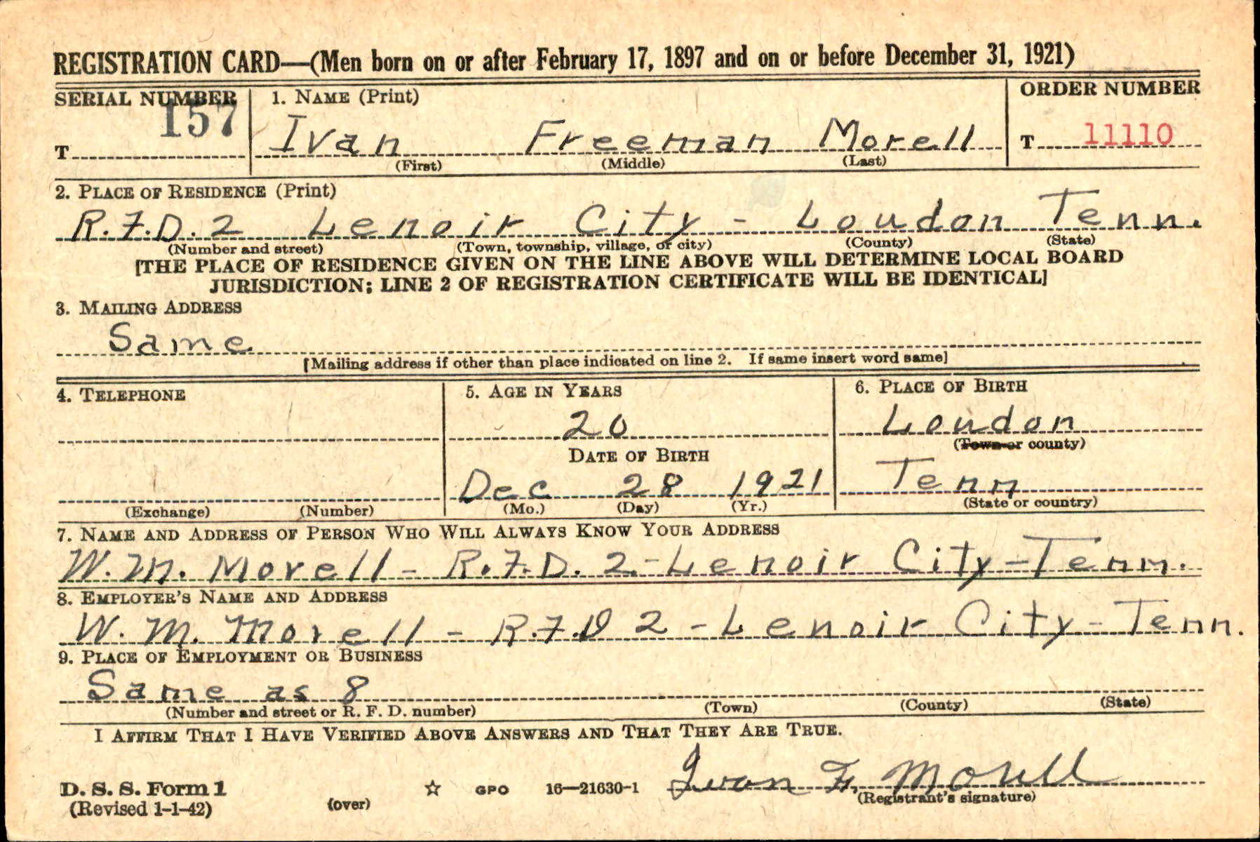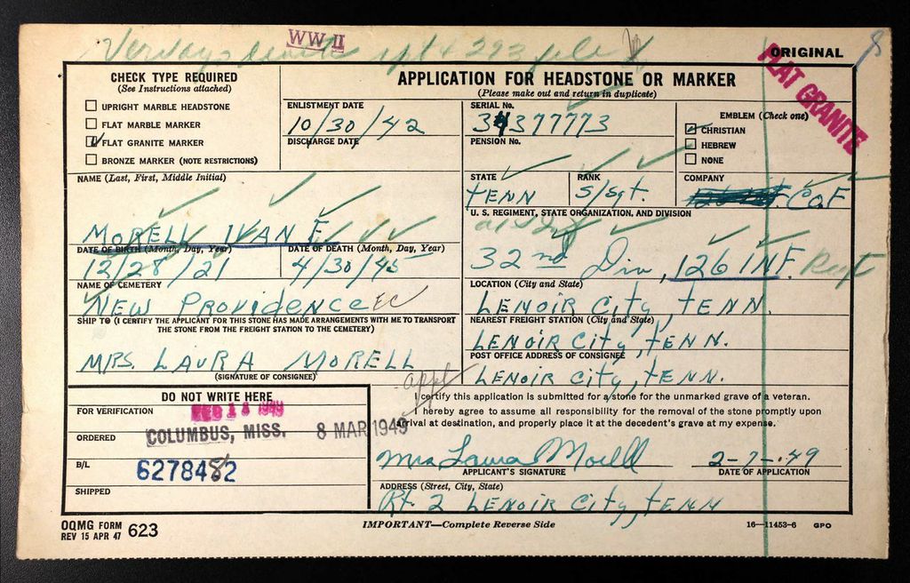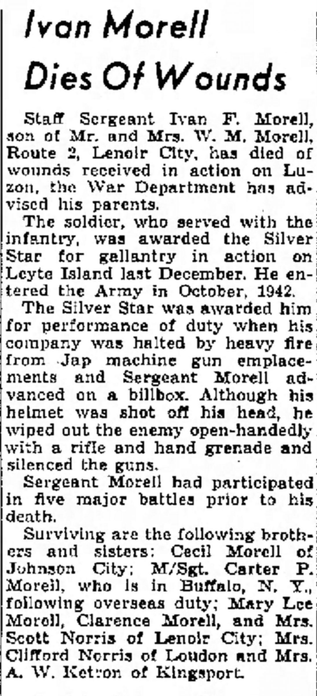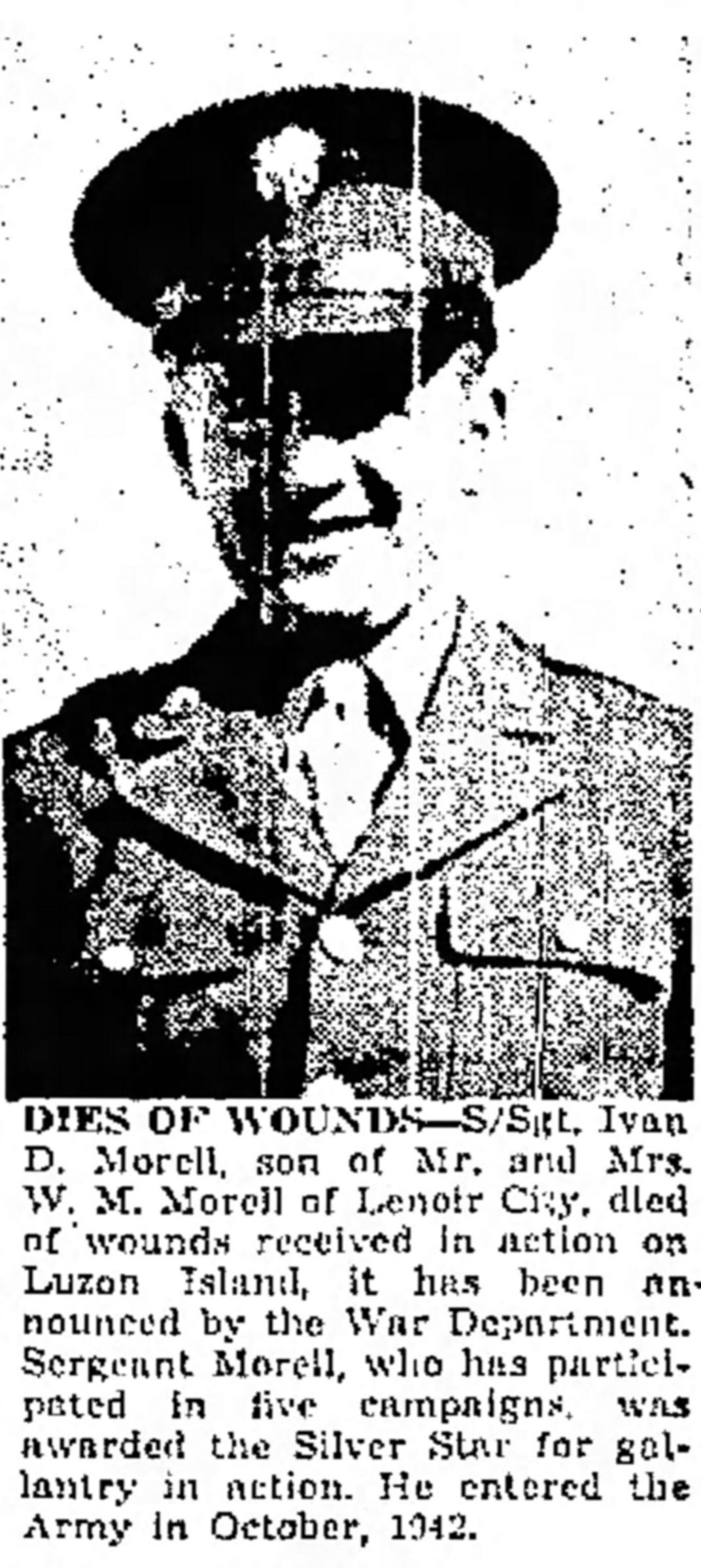 Staff Sergeant Ivan F. Morell, son of Mr. and Mrs. W.M. Morell, Route 2, Lenoir City, has died of wounds received in action on Luzon, the War Department has advised his parents. The soldier, who served with the infantry, was awarded the Silver Star for gallantry in action on Leyte Island last December. He entered the Army in October 1942.