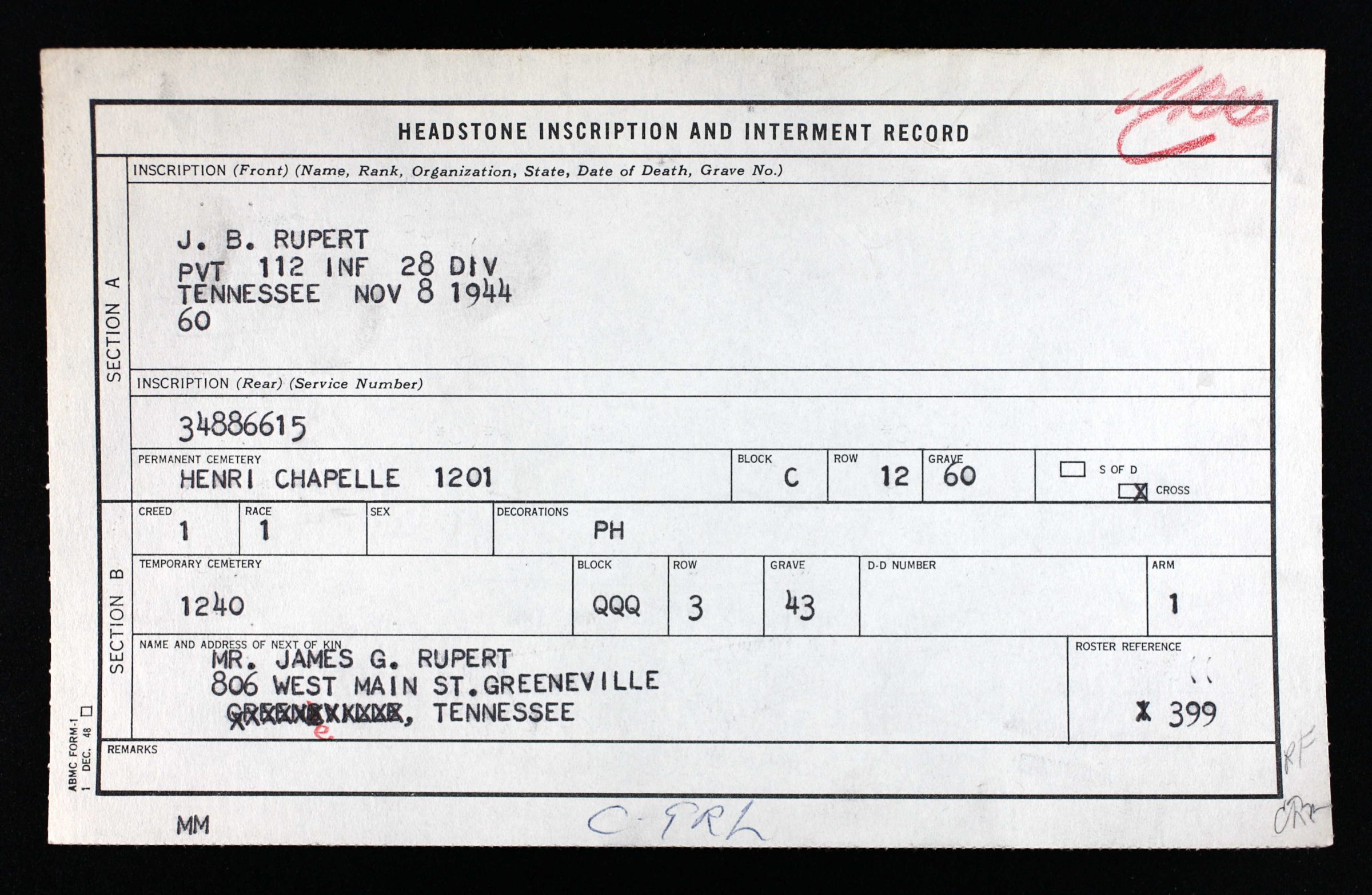 Buried at Henri-Chapelle American Cemetery, Belgium, C, 12, 60