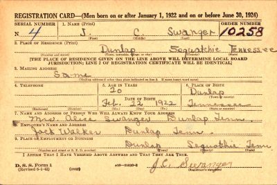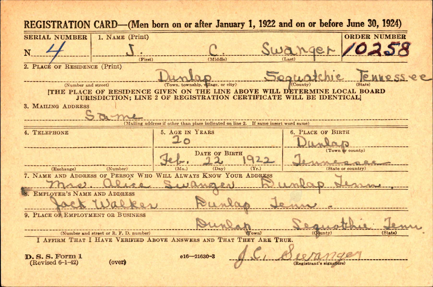 J.C. Swanter was born Dunlap, Tennessee. Son of Jacob W. Swanger and Alice Elizabeth Beshears. Service number; .