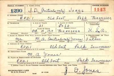 James D. (J.D.) Jones was born 14 October 1919 to Madison Alexander Jones and Minnie Couch who married 30 December 1900. He had brothers Jim “Button”, Hoyt, and sisters, Etholeen and Edith .
